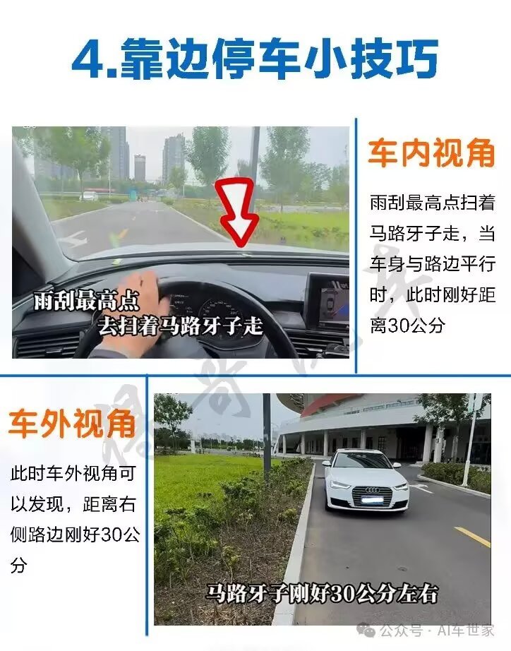 4. 靠邊停:雨刮最高點掃着馬路牙子開,車身平了踩停,剛好30公分不蹭胎。