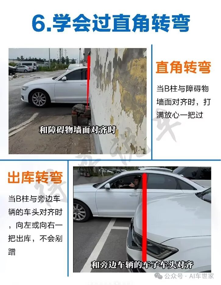 6. 直角/出庫:B柱(前後門中間柱)對齊牆/前車車頭,打滿方向直接過/出,不蹭!