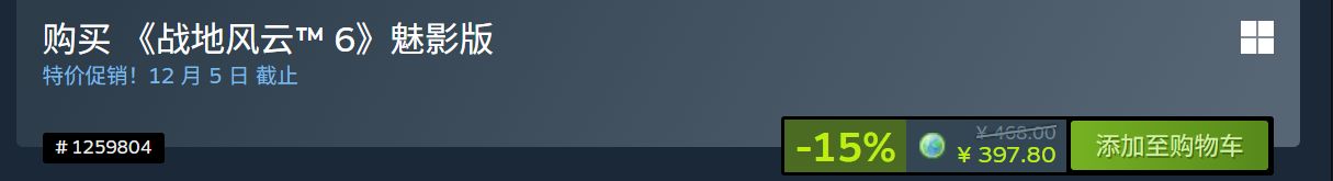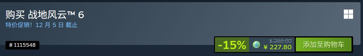 《战地6》发售一个多月打折!85 折新史低价!标准版售价 ¥227.8。