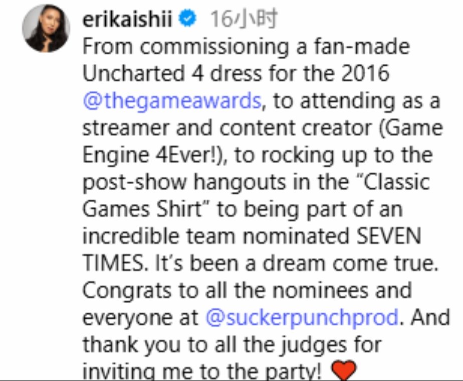 Erika Ishii動情地寫道,自己曾以主播身份參與TGA,如今則作爲《羊蹄山之魂》團隊一員獲得最佳表演提名。她特別感謝了開發商Sucker Punch工作室的每一位成員,並向其他提名者表示祝賀。爲表達喜悅,她同步分享了一組洋溢着開心笑容的新照片。《羊蹄山之魂》本屆TGA共獲七項提名,包括最佳動作冒險、最佳敘事等重要獎項。Erika Ishii將與本·斯塔爾(《光與影:33號遠征隊》)等強勁對手角逐最佳表演獎。TGA 2025頒獎典禮將於12月11日舉行,屆時將揭曉所有獎項的最終歸屬。