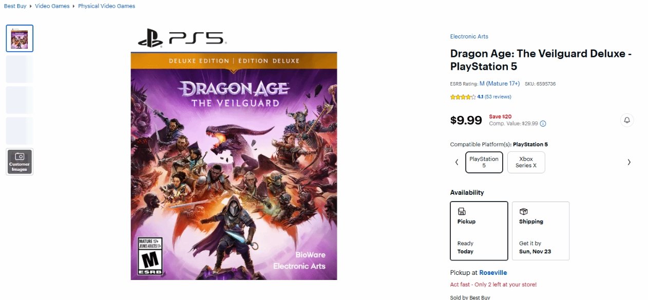 《龍騰世紀4:影障守護者》的價格出現驚人暴跌。發行不到一年,這款遊戲的PS5豪華版在部分零售平臺已跌至9.99美元(約人民幣71元),相比原價89.99美元,折扣幅度接近90%。