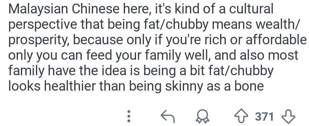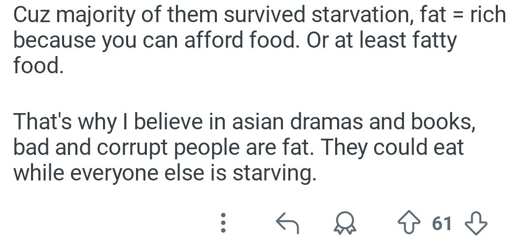 「因爲在大多數經歷過饑荒的社會里,肥胖=富裕,說明你喫得起飯(至少喫得起高熱量食物)。 所以我覺得在亞洲影視劇和書裏,反派胖子多——因爲他們在別人捱餓時還能大喫大喝。」