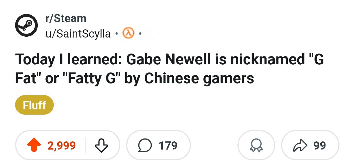 在Reddit上,某個遊戲玩家表示「今天我瞭解到:中國玩家給Gabe Newell起了個綽號叫『G胖』或『胖G』」