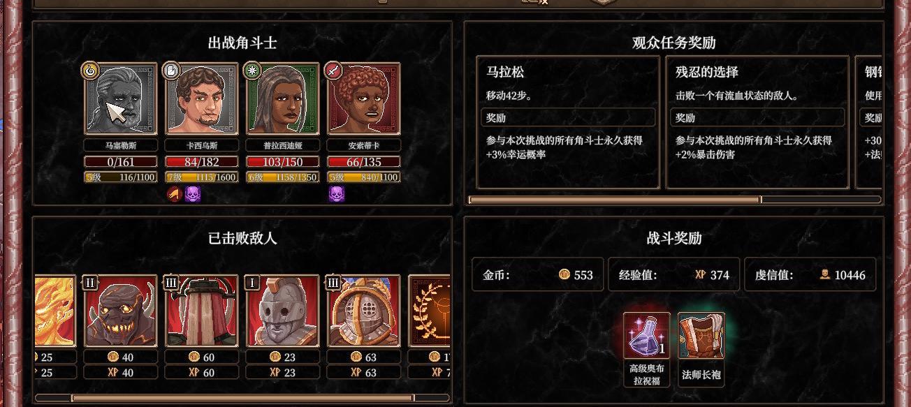 所以对《角斗士血域》的评价其实见仁见智,我没有那么擅长硬核策略的朋友说它的“永久死亡机制”很有压力感,而喜欢新奇随机性的朋友又觉得它的“新鲜耐玩感不够强”。