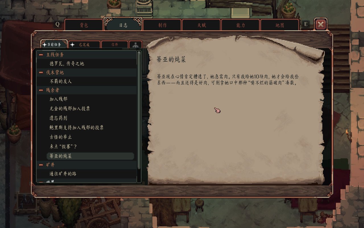 你可以用很多种方式完成任务,比如“蒂亚的炖菜”这项任务中,你需要提供10个“好肉”,正常情况下需要到营地外猎杀一种鸟类获得。