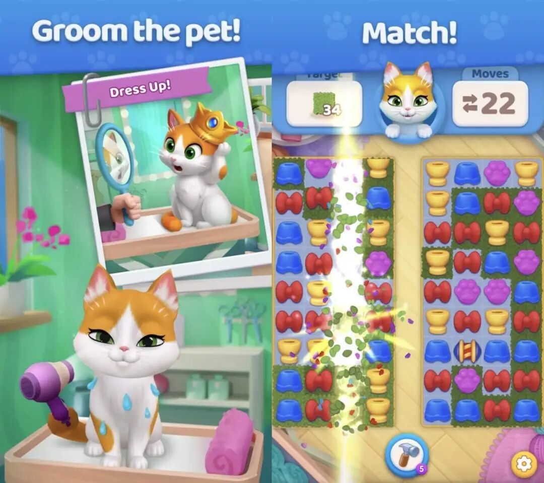 但其他市场就没有相应优势了。针对欧美市场的是旗下星曜工作室自研的《Paw Match-Puzzle Game》,也是最先掏出来的一款游戏。这是一款比较类似《Royal Match》的三消游戏,但采用了萌宠题材,还加入了少量的装扮和模拟经营要素。游戏在2021年下半年陆续上线了部分海外市场,成绩不太好。