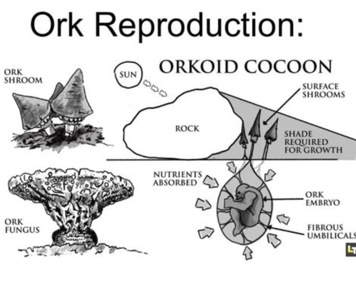在适宜环境下,苞荚会依次孕育出鼻涕精(Snotling)、屁精(Gretchin)等低等绿皮生物,最终诞生成熟的欧克蛮人,而整个过程无需任何亲代抚育,完全依靠自然环境即可完成。
