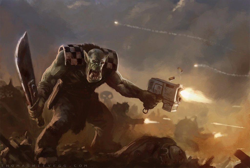 他们便是欧克蛮人(Ork),俗称“绿皮”,一个被基因编码了战争本能、被灵能立场扭曲了物理规则、被原始野性驱动着永恒扩张的奇特物种。