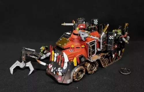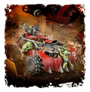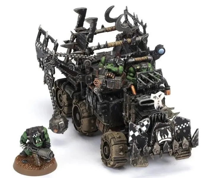 外观与构造:由废料拼接而成,机身是简陋金属框架,搭载单旋翼+尾部推进器,装甲薄如纸(仅能抵御轻武器),涂装鲜艳杂乱,常焊有尖刺、涂鸦或战利品(如敌方徽章),飞行时噪音震天,靠兽人“ waaagh! 灵能”勉强维持平衡,随时有失控坠毁的风险。