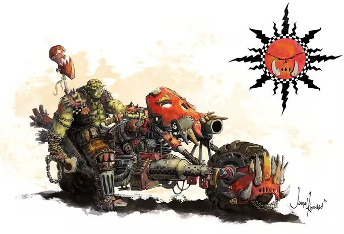 邪日氏族(Bad Moons)则是速度的狂热追求者,痴迷于各类载具——战争摩托、爆弹卡车、喷气战机,甚至会将自己的身体进行仿生改造以提升速度。