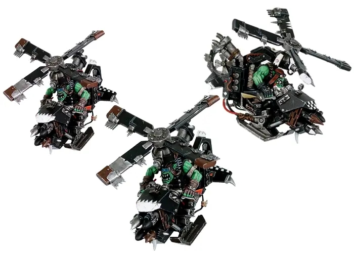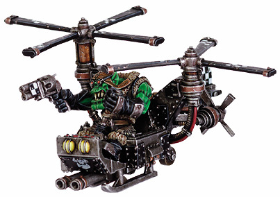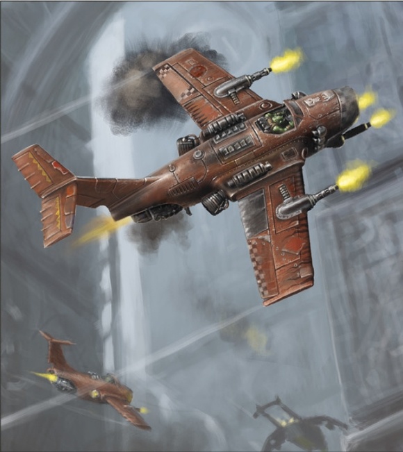 欧克的战斗机,装备大量突突枪和火箭发射器,能在天空中倾泻弹雨。这些飞机设计简陋,飞行特性糟糕,但在WAAAGH!力场的加持下能保持空中平衡并做出各种不可能的机动。