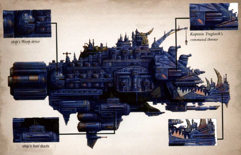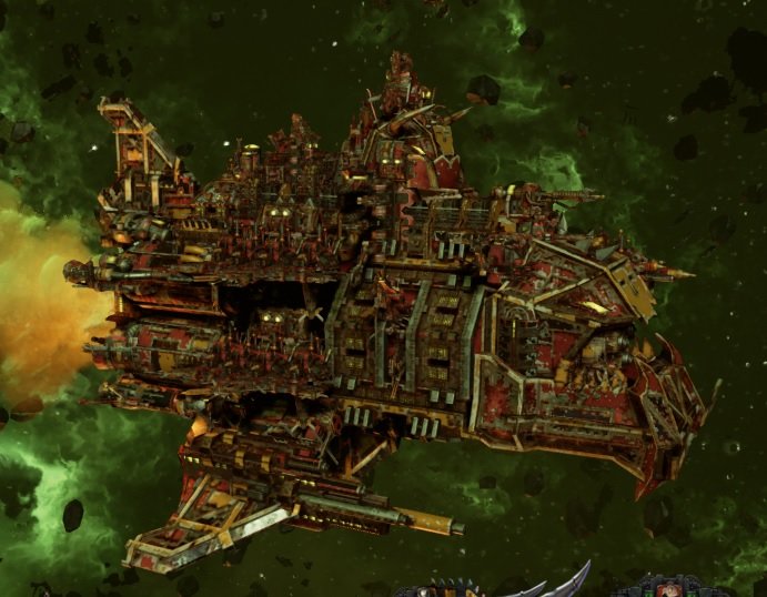 这类舰船通常由战争头目亲自指挥,舰体装饰着大量缴获的敌方旗帜和头骨,是舰队的"旗舰候选人"。少数特别强大的会被欧克称为"Deadnot"(死亡之船),成为整个舰队的核心。