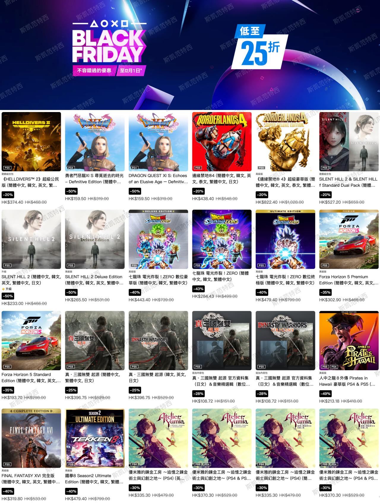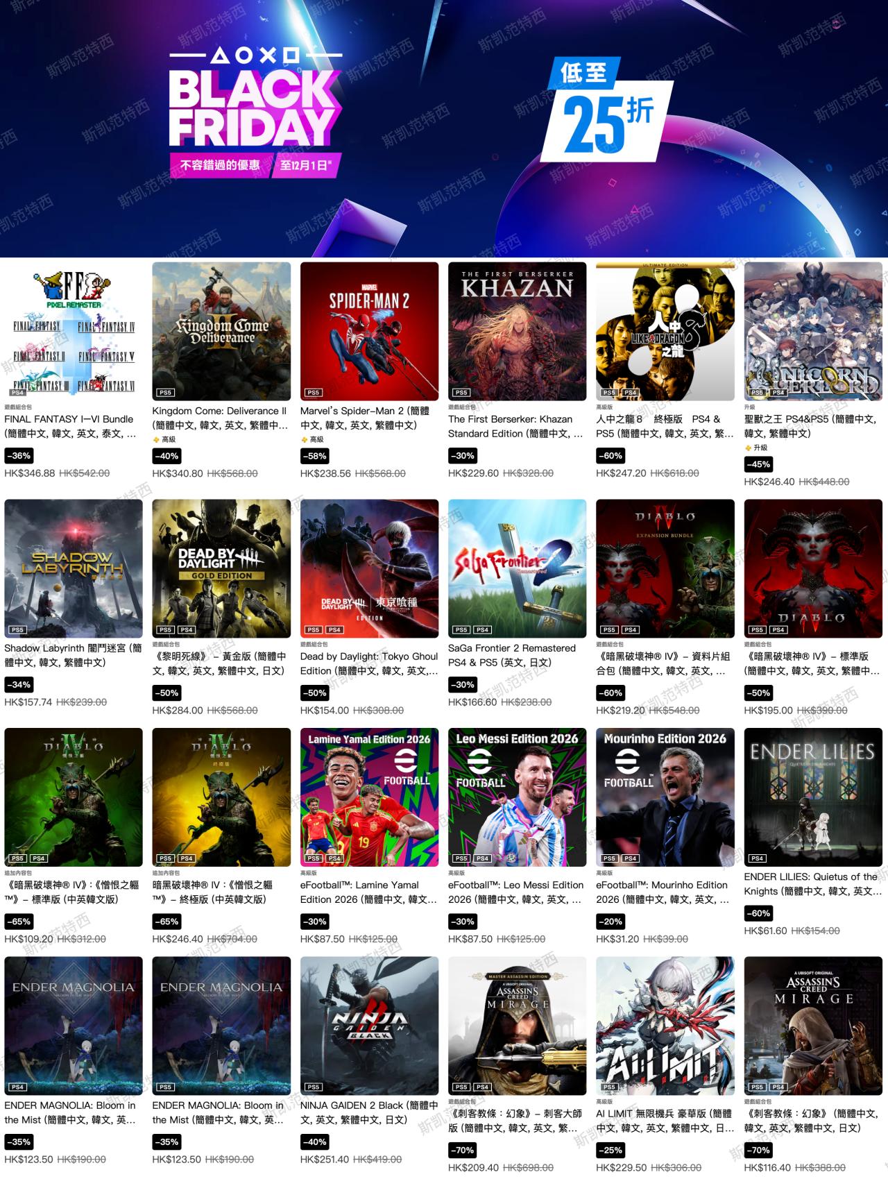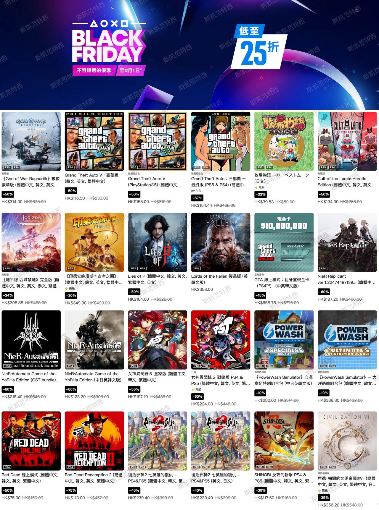 索尼PlayStation港服商店现已开启“Black Friaday”游戏折扣,与日服的“PS5五周年”活动还是有些区别的,比如港服的法环就没打折,本次游戏优惠活动截至12月1日,有需要的朋友可以关注下。
