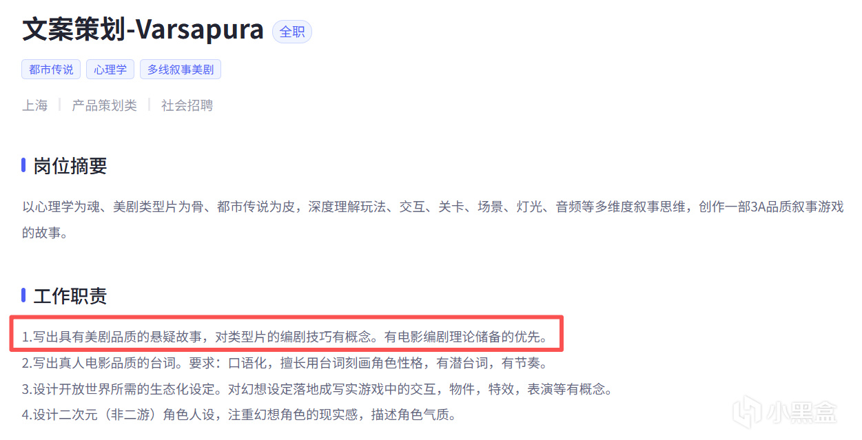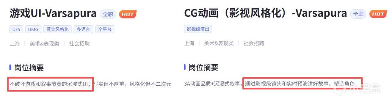 此外在游戏UI、CG动画多个岗位的摘要中,都能看到“不破坏游戏和叙事节奏”“通过影视级镜头和实时预演讲好故事、塑造角色”等描述,这些岗位虽然与游戏剧情策划不沾边,但做的事情却是服务于《Varsapura》的剧情演绎。