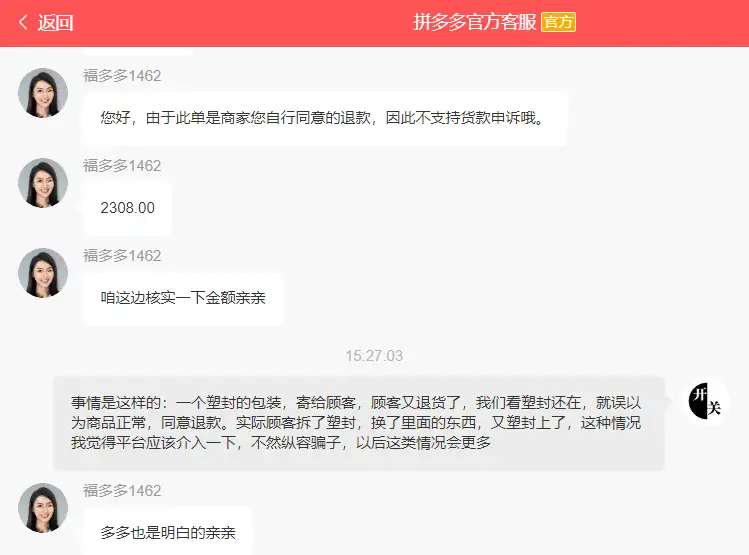 平台找了个专员来跟进此事,但无解,意思是商家主动同意的退款,无法申诉:
