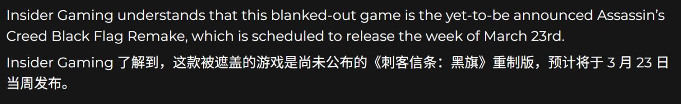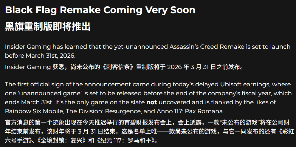 根據Insider Gaming披露的消息,這款重製版距離正式發售僅剩數月之遙。在育碧最新發布的季度及半年度財報中,官方確認將在本財季(2026年3月前)推出一款未公開作品。Insider Gaming指出該作正是2013年發行的《刺客信條4:黑旗》重製版——該作首次在系列引入海戰與探索玩法,其後衍生出命運多舛的獨立遊戲《碧海黑帆》。