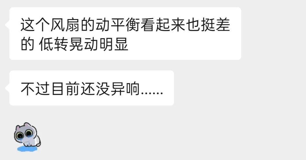 坦白地說,朋友對這款風扇的反饋也很一般:扇葉的動平衡不好,低轉晃動明顯;對16cm的葉形來說,500RPM的最低速率也太高了。
