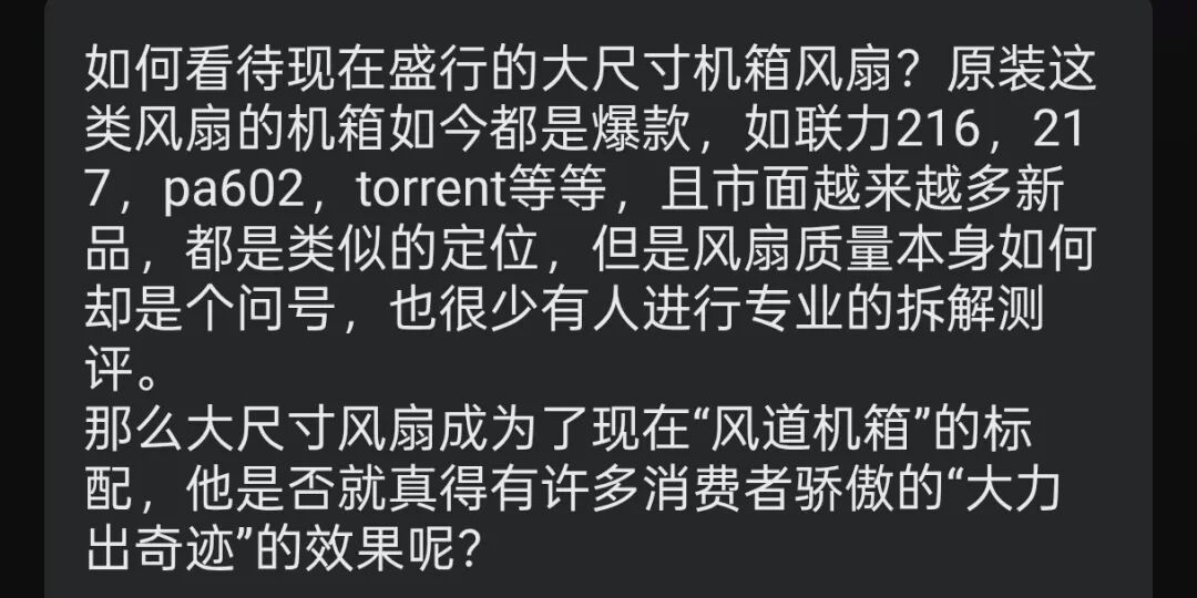 近期,我們收到了一位粉絲的提問:如何看待現在盛行的大尺寸機箱風扇?