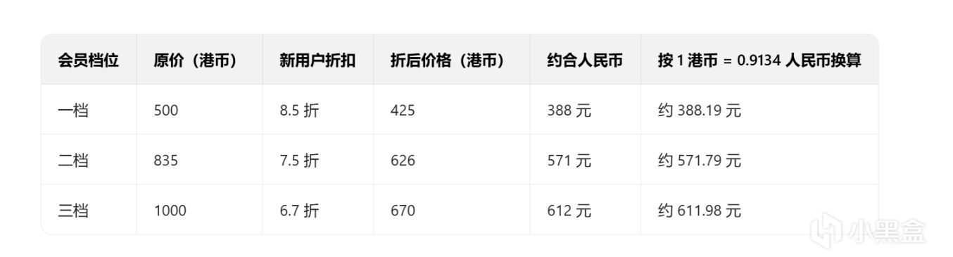 這次會員也參與了折扣。新用戶(指當前爲非會員狀態)開一檔會員8.5折。原價500港幣,折後425港幣(約388元)。但根據一些朋友反饋,他們開一檔沒有折扣或只有8折,還是以實際情況爲準;二檔會員7.5折,原價835港幣,折後 626港幣(約571元)。三檔會員6.7折,原價1000港幣,折後670港幣(約612元)。