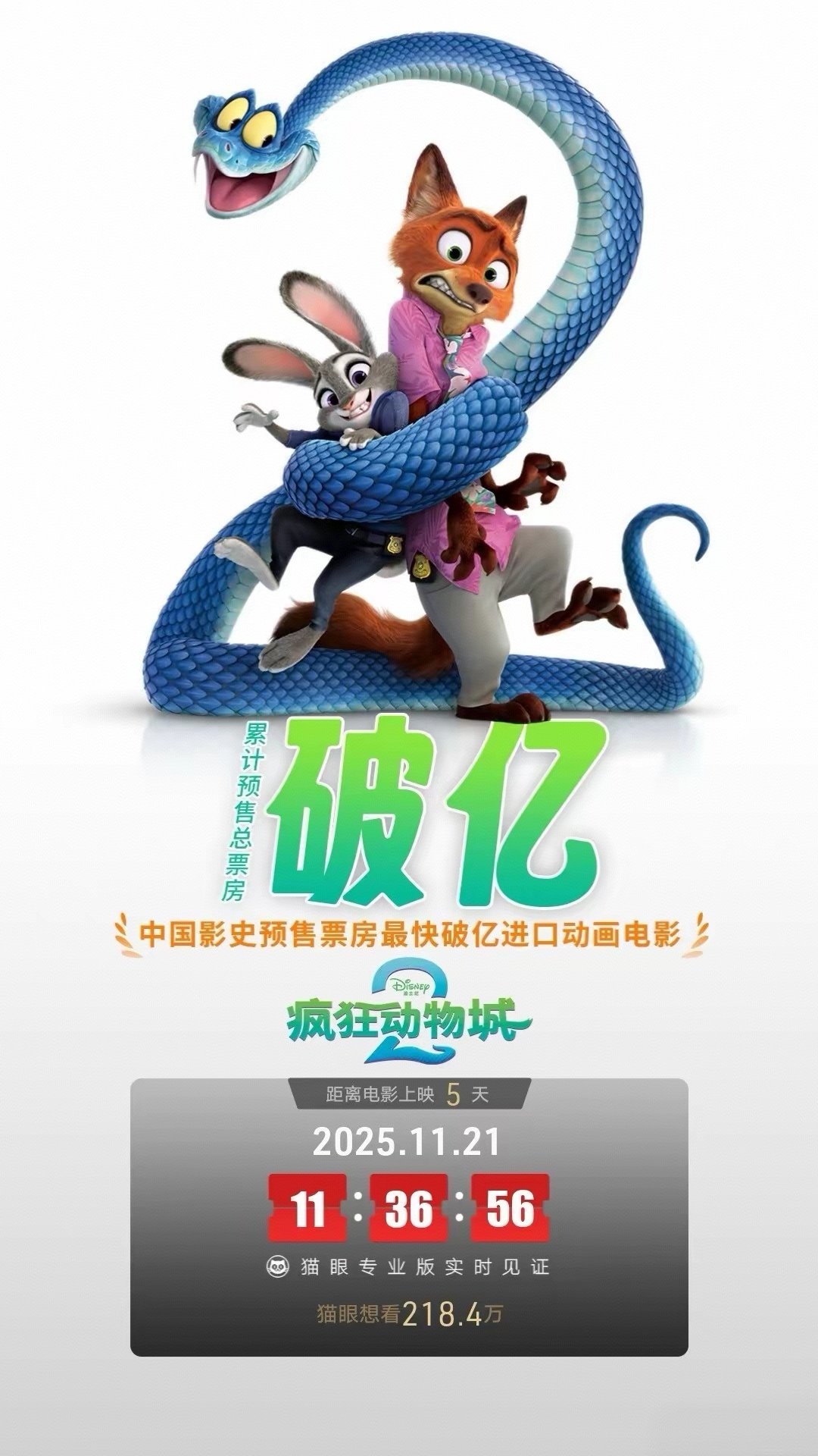 11月21日,熱門迪士尼動畫電影《瘋狂動物城 2》中國內地預售票房突破1億元大關,預售人次超 240萬。