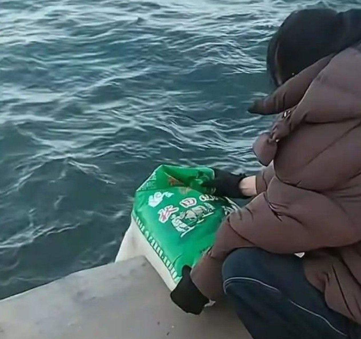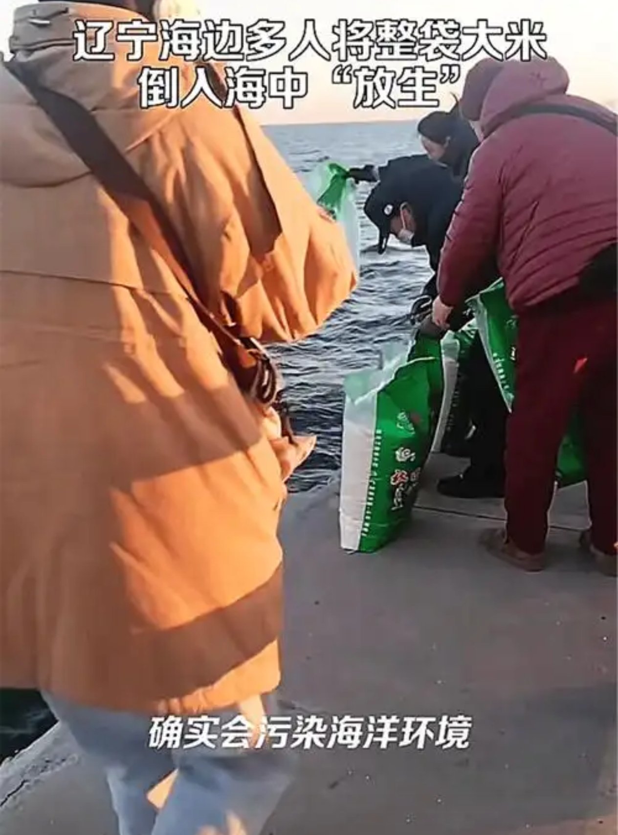 近日辽宁葫芦岛一处海边码头,多名中老年人将多袋大米倾倒入海,口中念念有词。视频中,一名短发女子在通话时称“在海边,刚放生”。