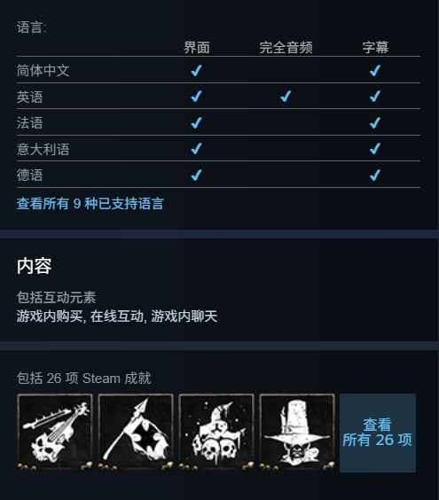 游戏包括26项Steam成就,支持简体中文界面和字幕