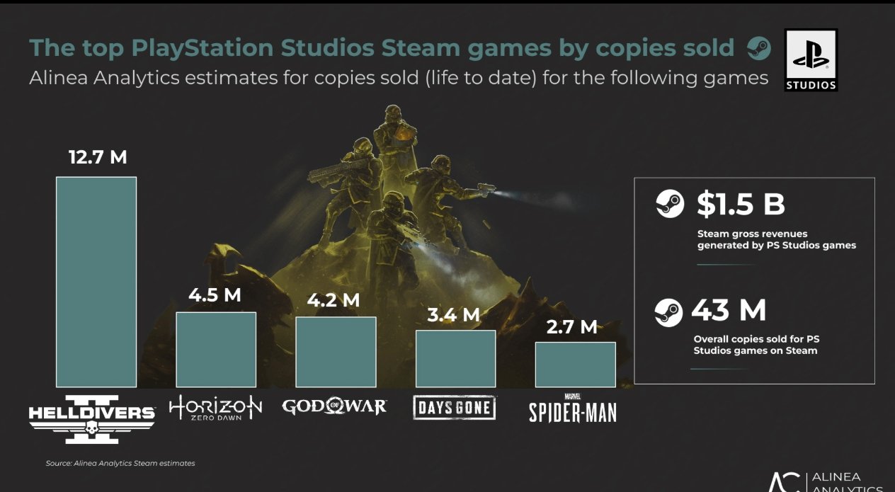 《绝地潜兵2》成为索尼在Steam平台最成功的作品,自2024年2月发售以来已售出1270万份。其他表现突出的游戏包括《地平线:零之曙光》(450万份)、《战神4》(420万份)、《往日不再》(340万份)以及《漫威蜘蛛侠:重制版》(270万份)。报告同时指出,PlayStation游戏在Steam的“新鲜感”正逐渐消退。《战神4》发售后427天内售出250万份,而其续作《战神:诸神黄昏》同期销量仅为前作的40%。PC游戏已成为索尼第一方作品收入的重要来源,占其第一方游戏收入近三分之一。