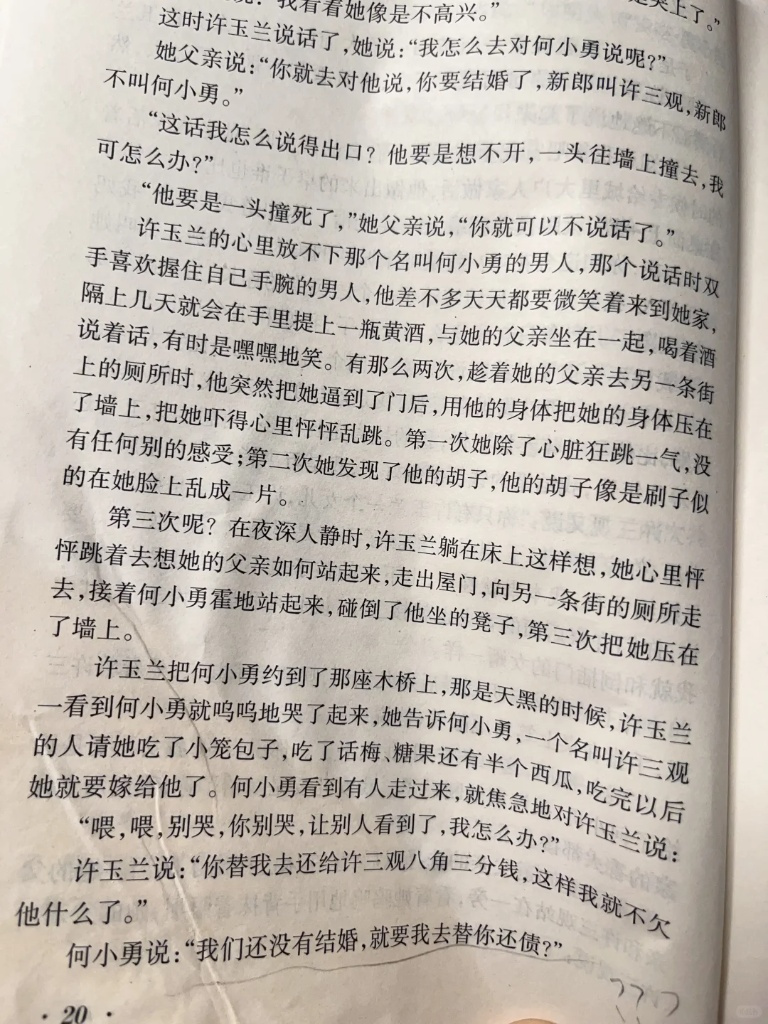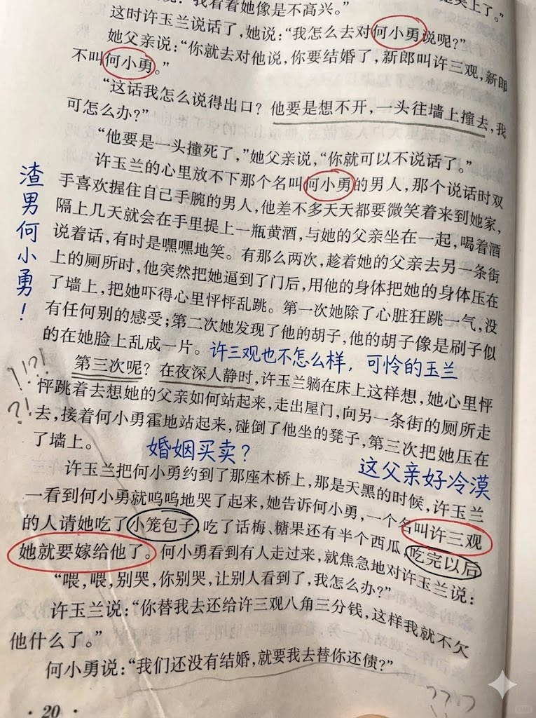然后,来测一下文字生成,这是我从网上找的许三观卖血记的节选图片,我们把他丢给大香蕉,让他随意勾画,写读书笔记。