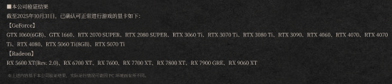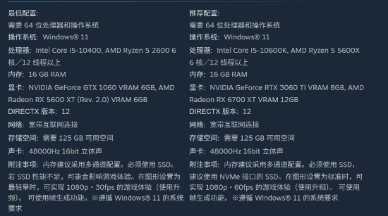 最低配置需RTX 1060(6G)显卡,可以1080P/30帧低画质游玩。推荐RTX 3060 Ti(8G)以上显卡,可以1080P/60帧中等画质游玩。存储空间则需125G,本作容量还是挺大的。