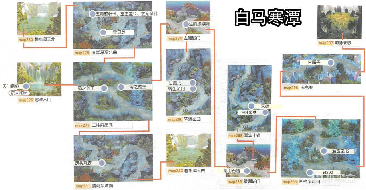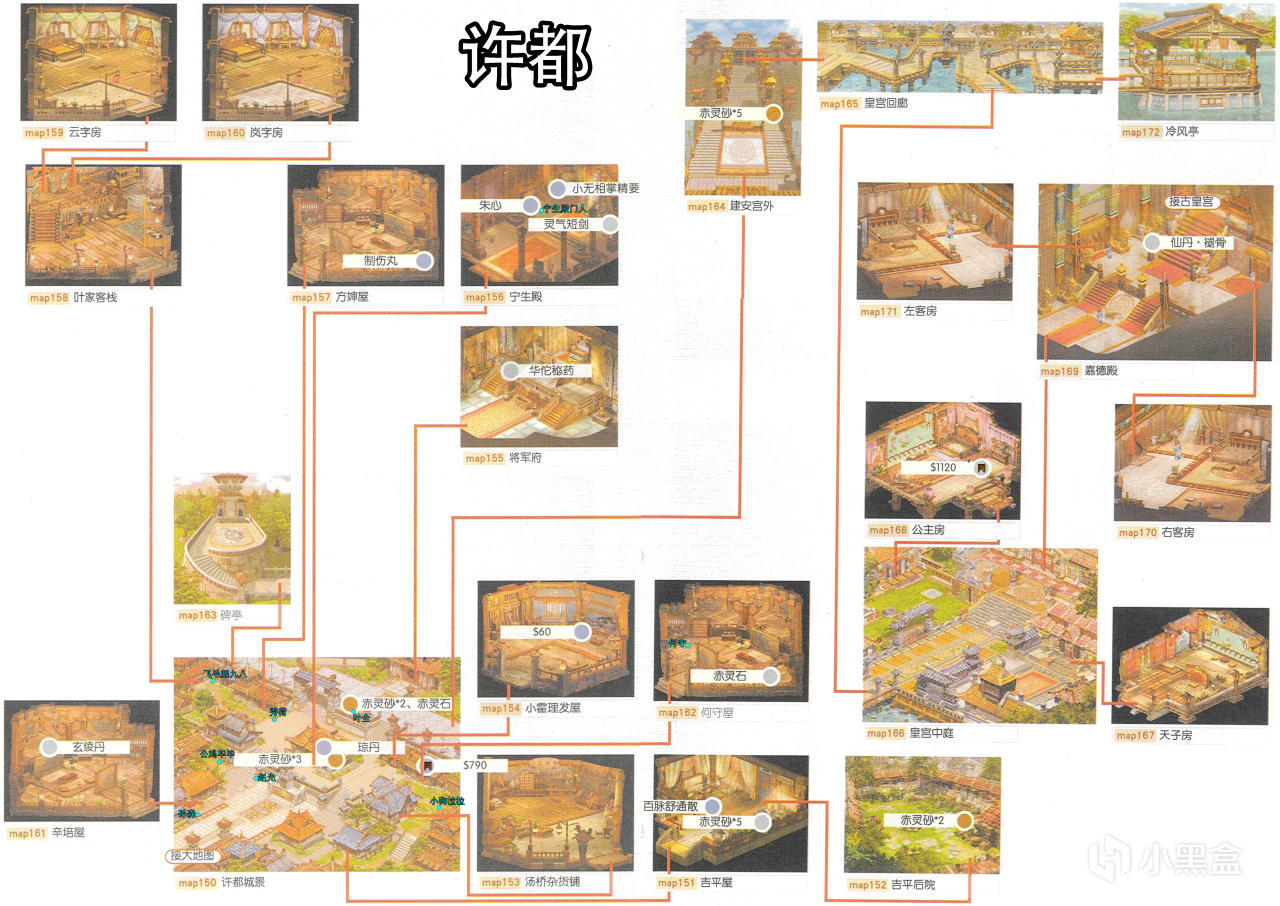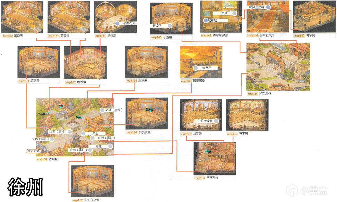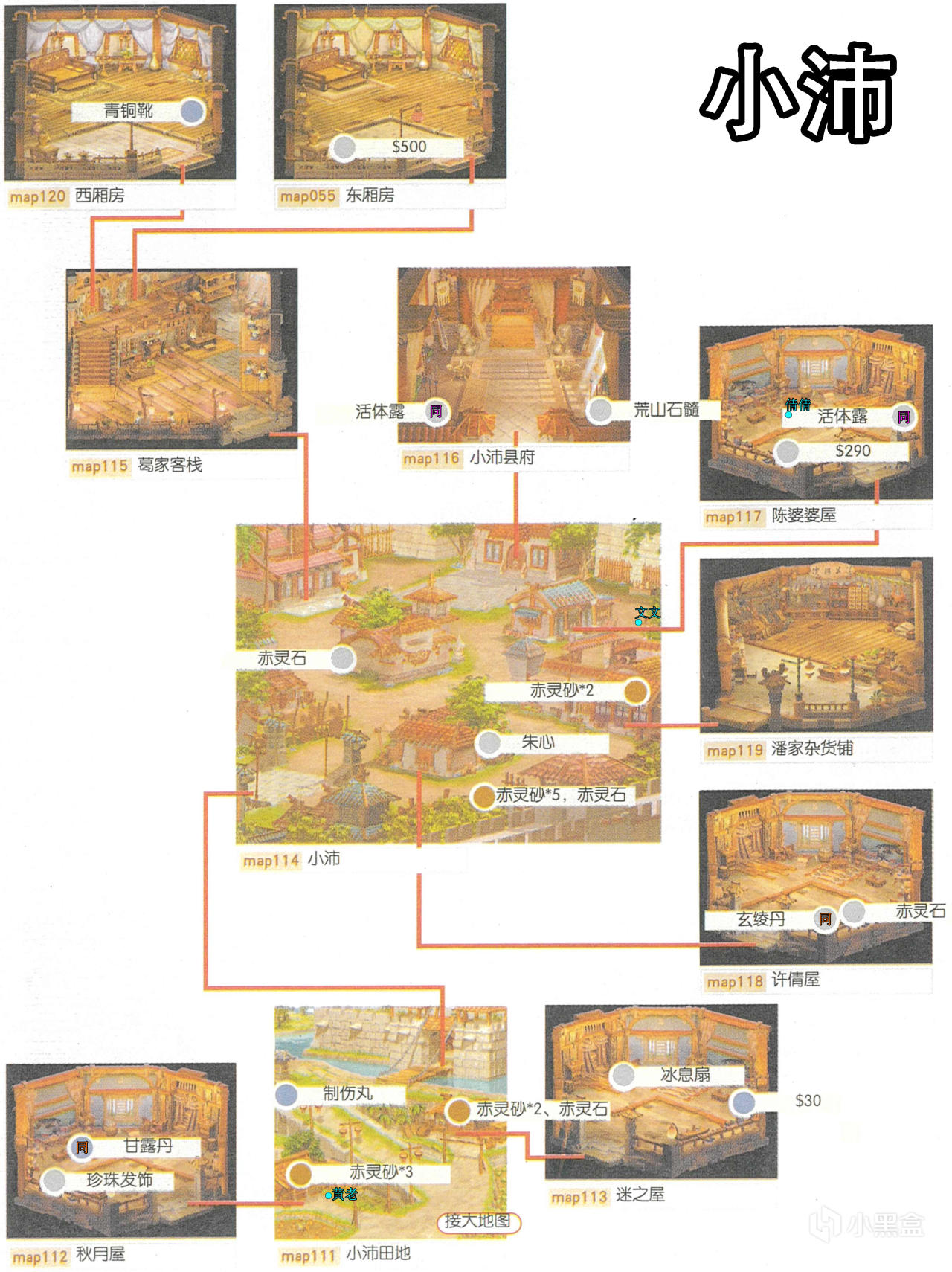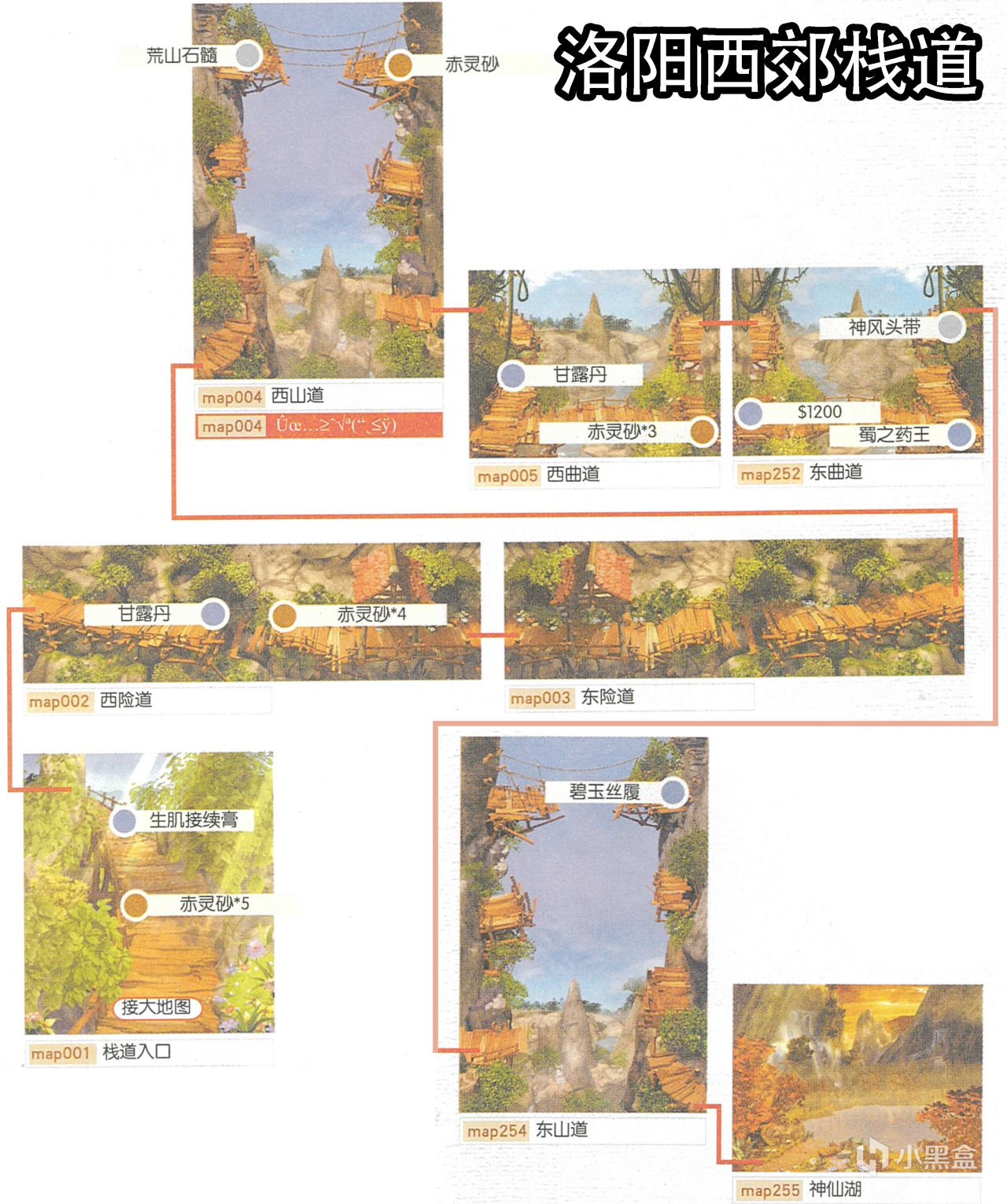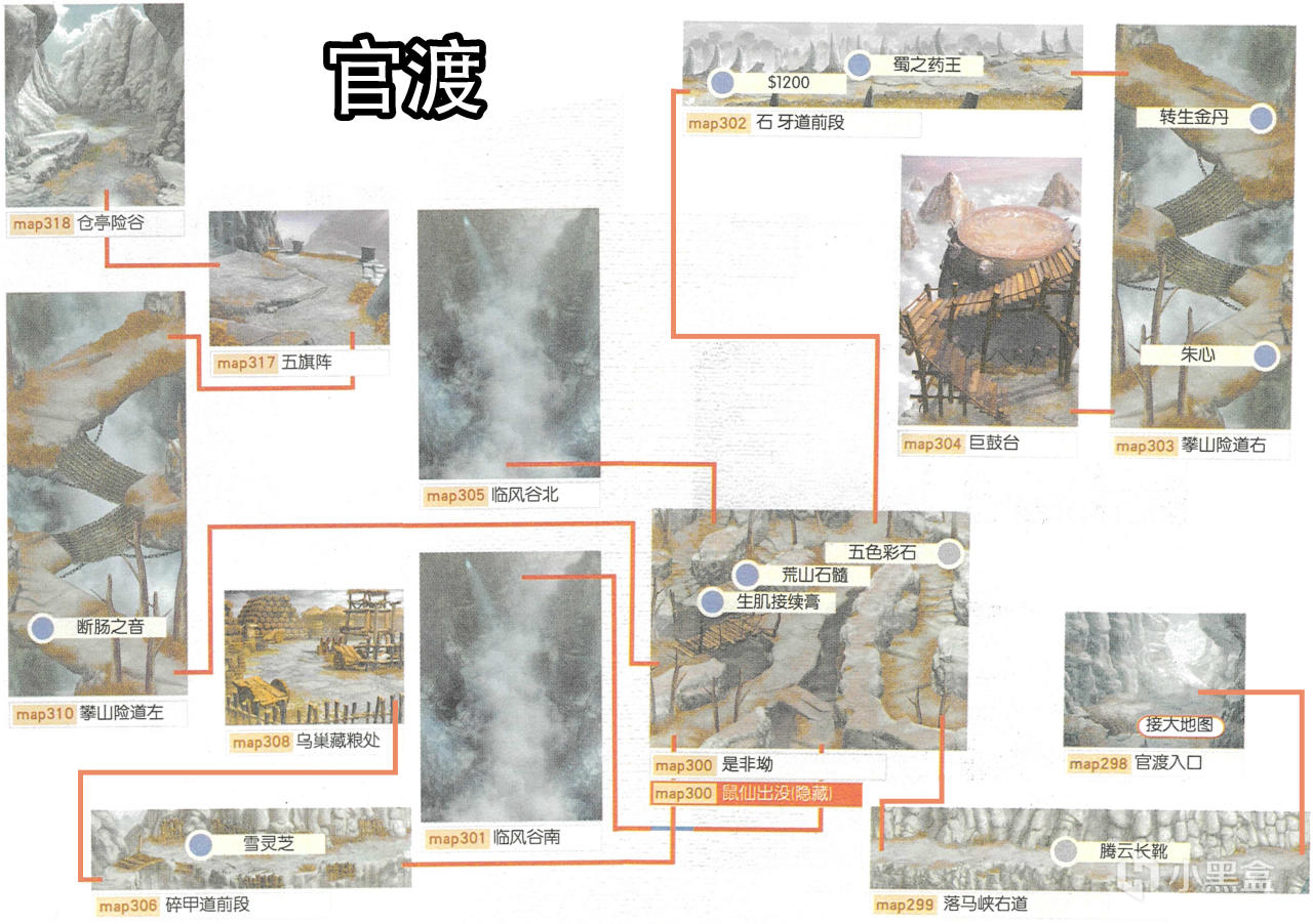 [備註]深色標識的物品爲隱藏的礦石寶箱,暫時無法看見,可靠近後按空格拾取;在屋頂的物品需要等有會跳躍的化印獸加入才能拾取;拾取到的大行氣散先留着,支線任務有用;各地的飛毛腿支線將作爲抉擇結局的節點,建議都留到最後再做。