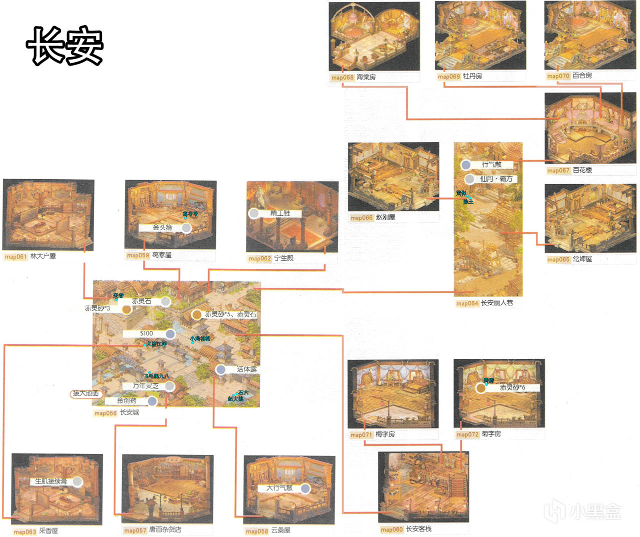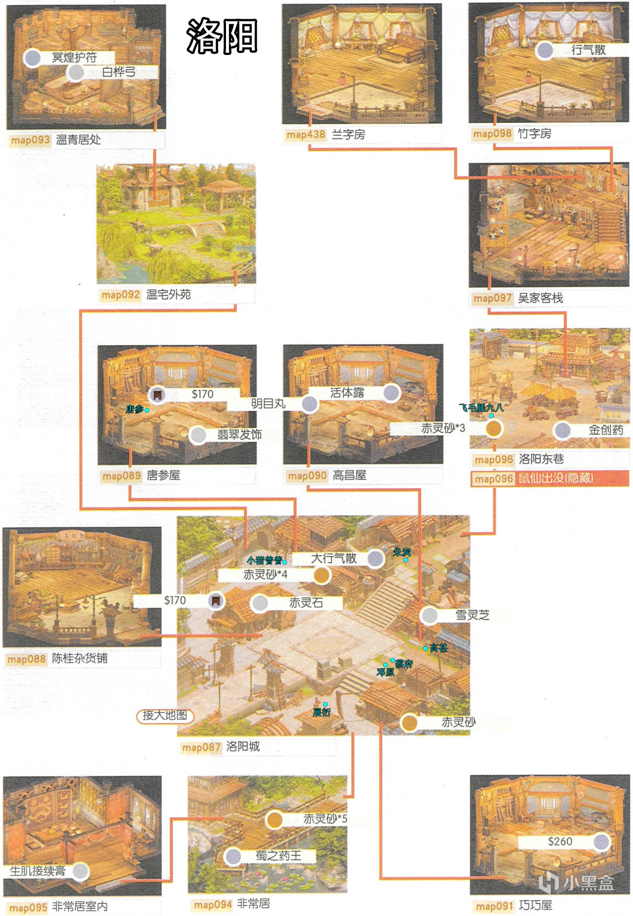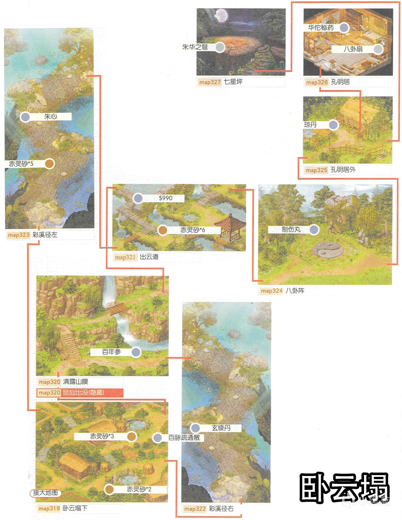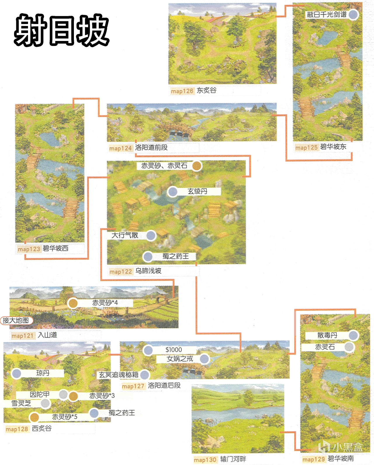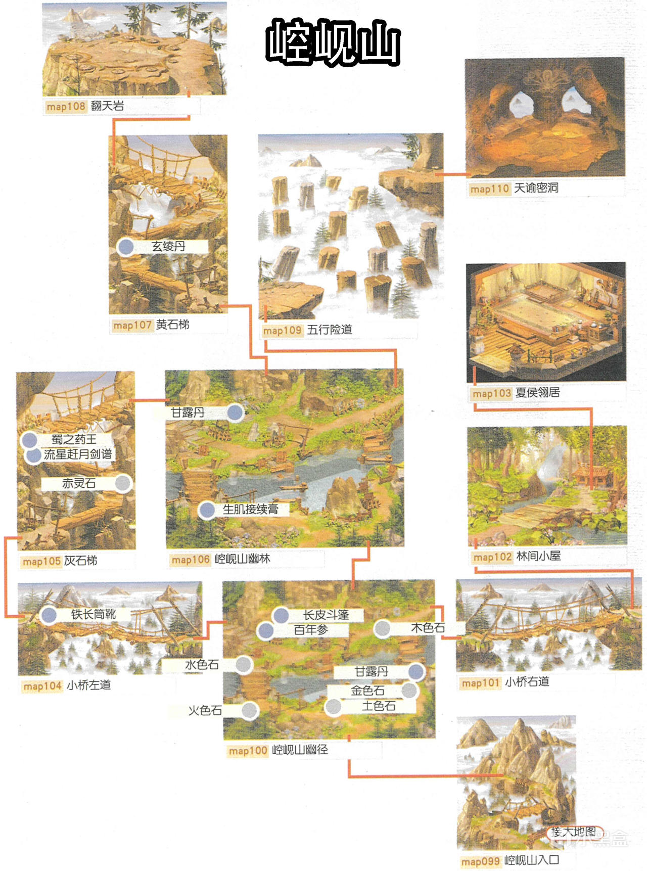 [備註]深色標識的物品爲隱藏的礦石寶箱,暫時無法看見,可靠近後按空格拾取;在屋頂的物品需要等有會跳躍的化印獸加入才能拾取;拾取到的大行氣散先留着,支線任務有用;各地的飛毛腿支線將作爲抉擇結局的節點,建議都留到最後再做。