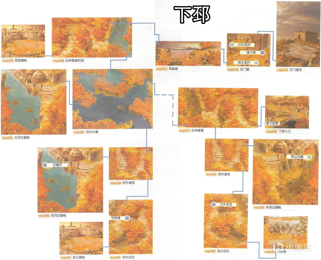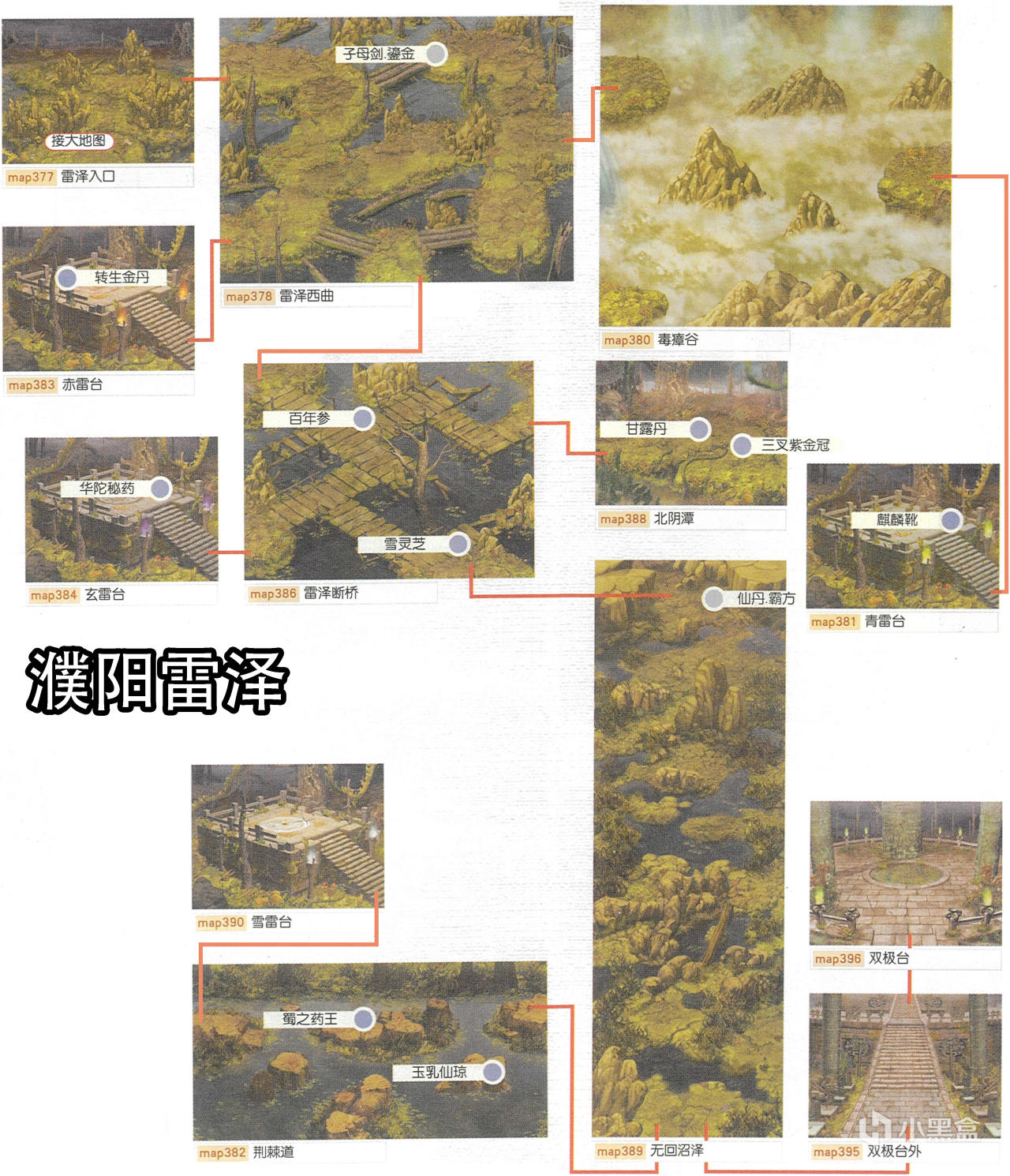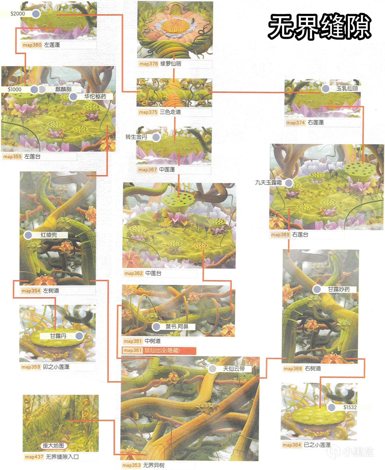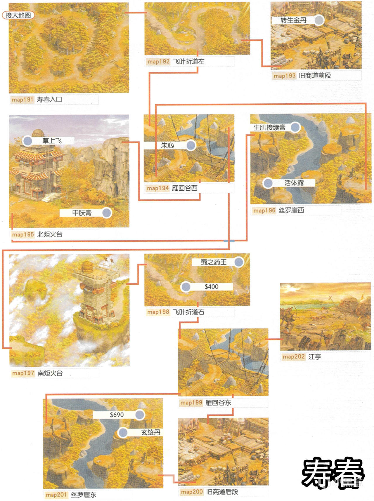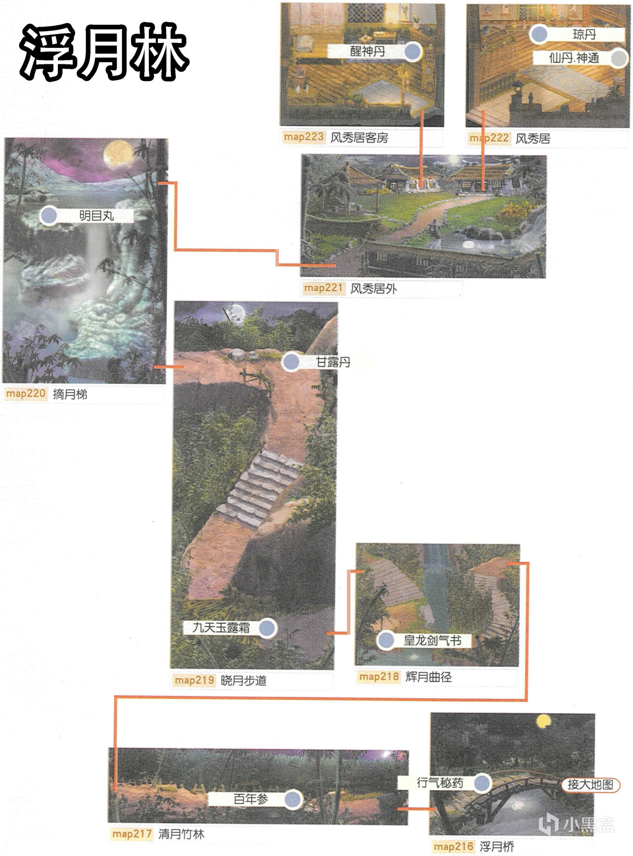[備註]深色標識的物品爲隱藏的礦石寶箱,暫時無法看見,可靠近後按空格拾取;在屋頂的物品需要等有會跳躍的化印獸加入才能拾取;拾取到的大行氣散先留着,支線任務有用;各地的飛毛腿支線將作爲抉擇結局的節點,建議都留到最後再做。