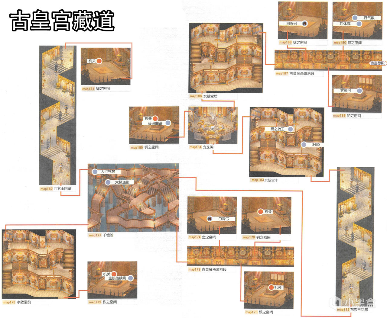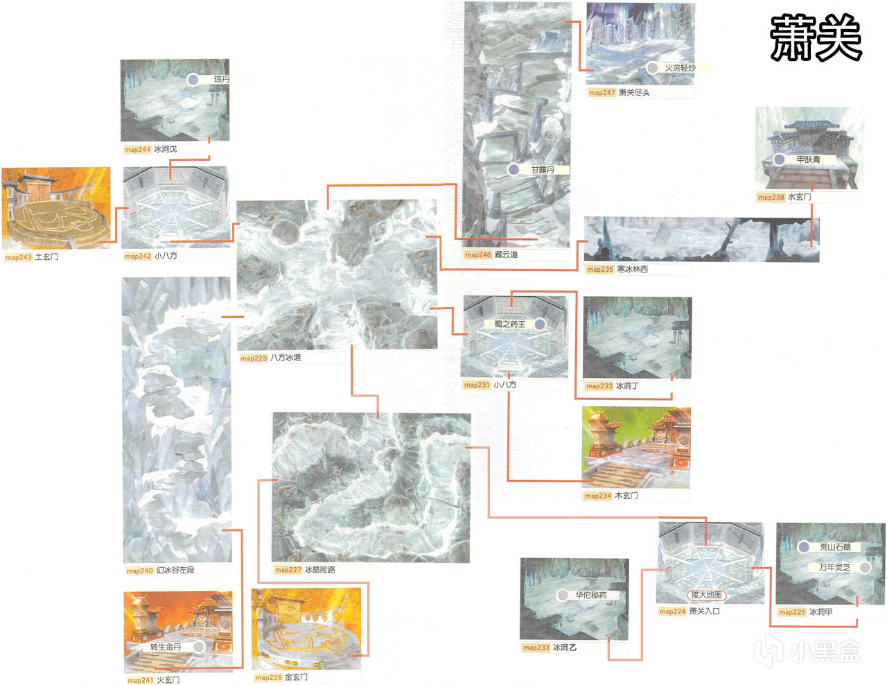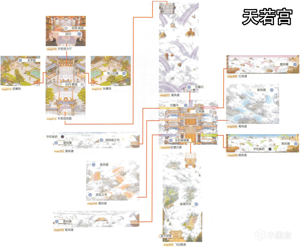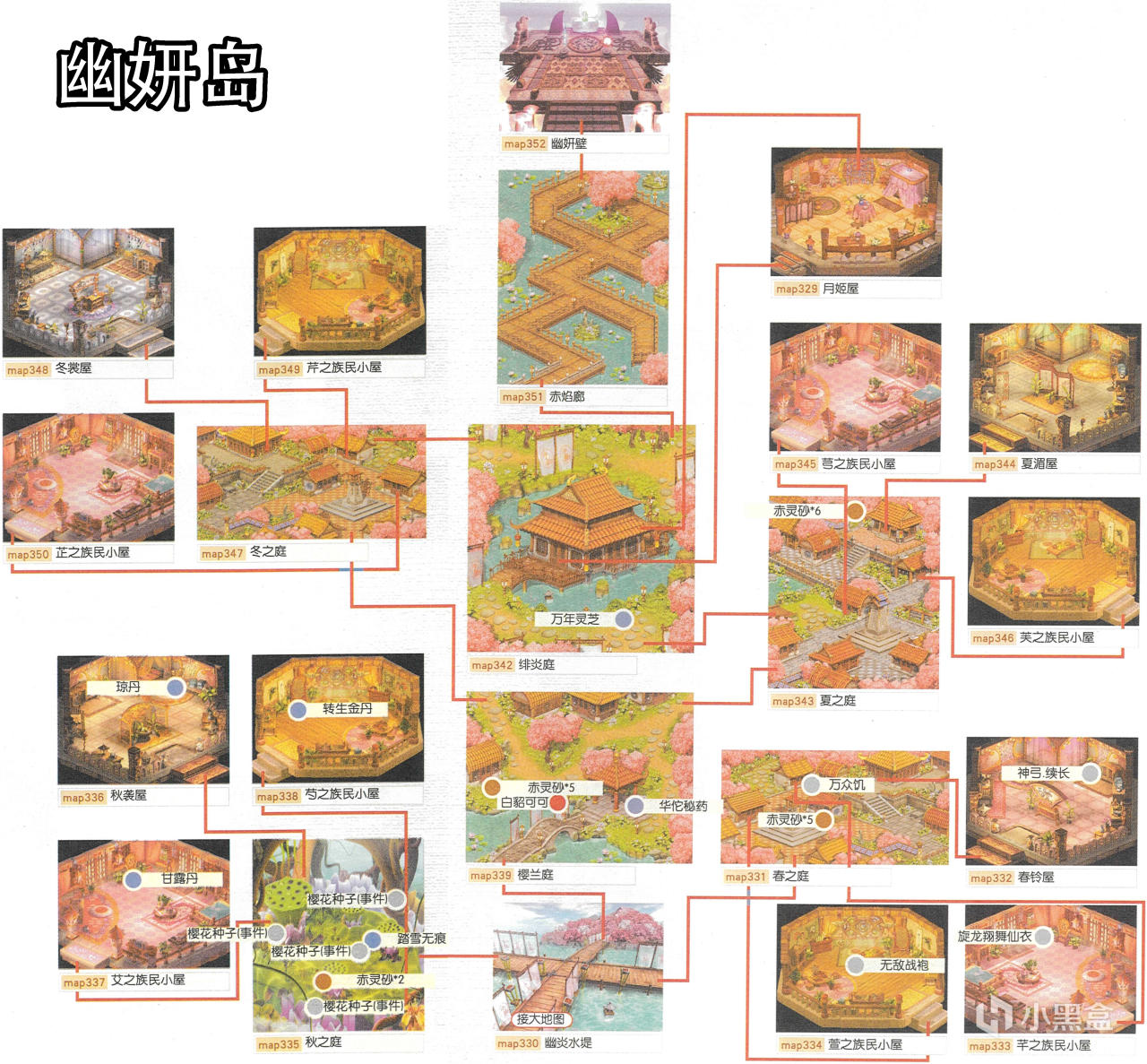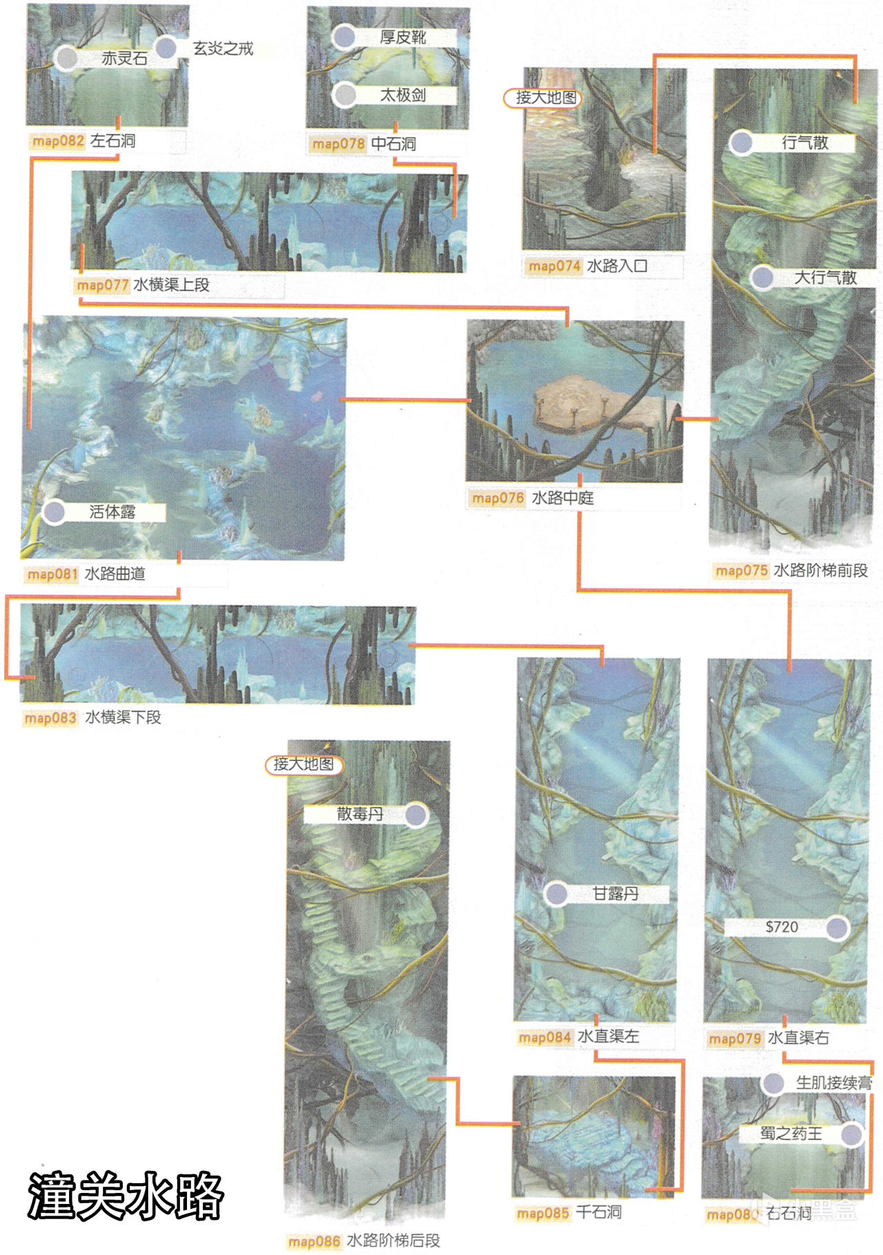 [備註]深色標識的物品爲隱藏的礦石寶箱,暫時無法看見,可靠近後按空格拾取;在屋頂的物品需要等有會跳躍的化印獸加入才能拾取;拾取到的大行氣散先留着,支線任務有用;各地的飛毛腿支線將作爲抉擇結局的節點,建議都留到最後再做。