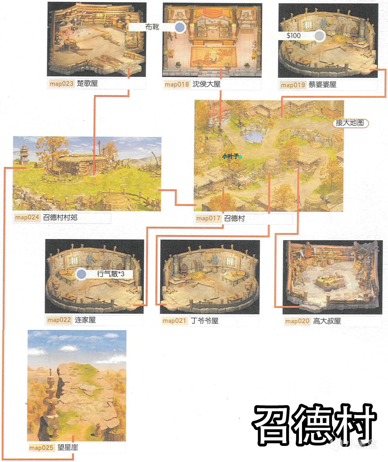 [主線]和村中所有人交談→前往望星崖→和高大叔屋前的高大叔交談→前往沈侯大屋→離開召德村。