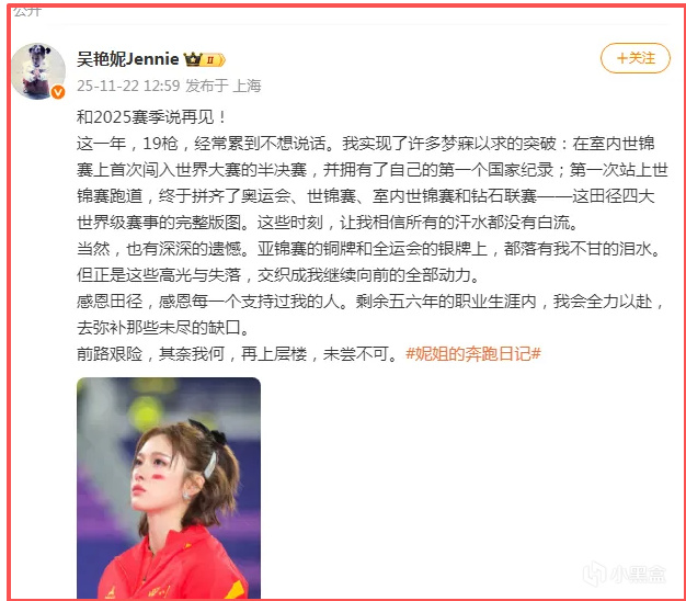 11 月 22 日,田徑名將吳豔妮在社交平臺分享 2025 賽季總結,字裏行間滿是堅持與決心,讓不少網友爲她動容。這位在賽場上以爆發力著稱的選手,今年經歷了 19 場賽事的高強度考驗,累到不想說話成了常態,卻也交出了亮眼的突破成績單。