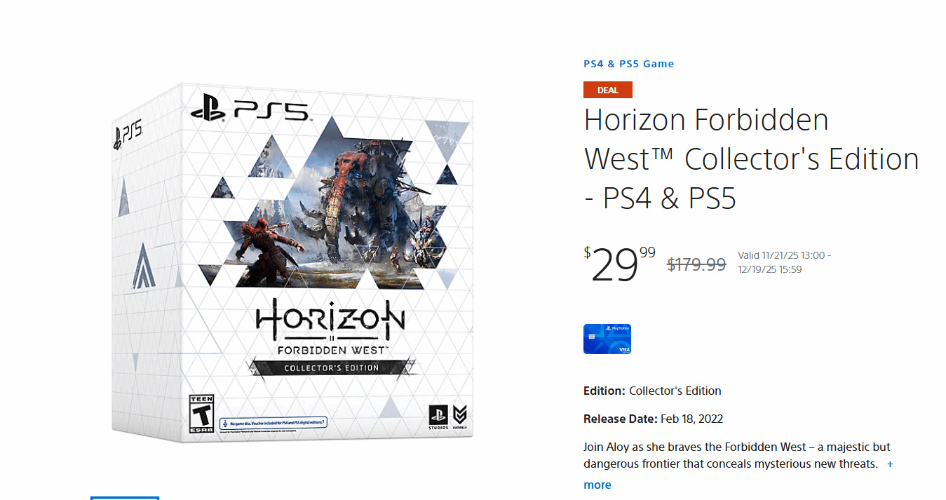 PlayStation對《地平線:西之絕境》典藏版進行了大幅調價,從原來的180美元直降至30美元,降幅高達150美元(約1066元人民幣)。