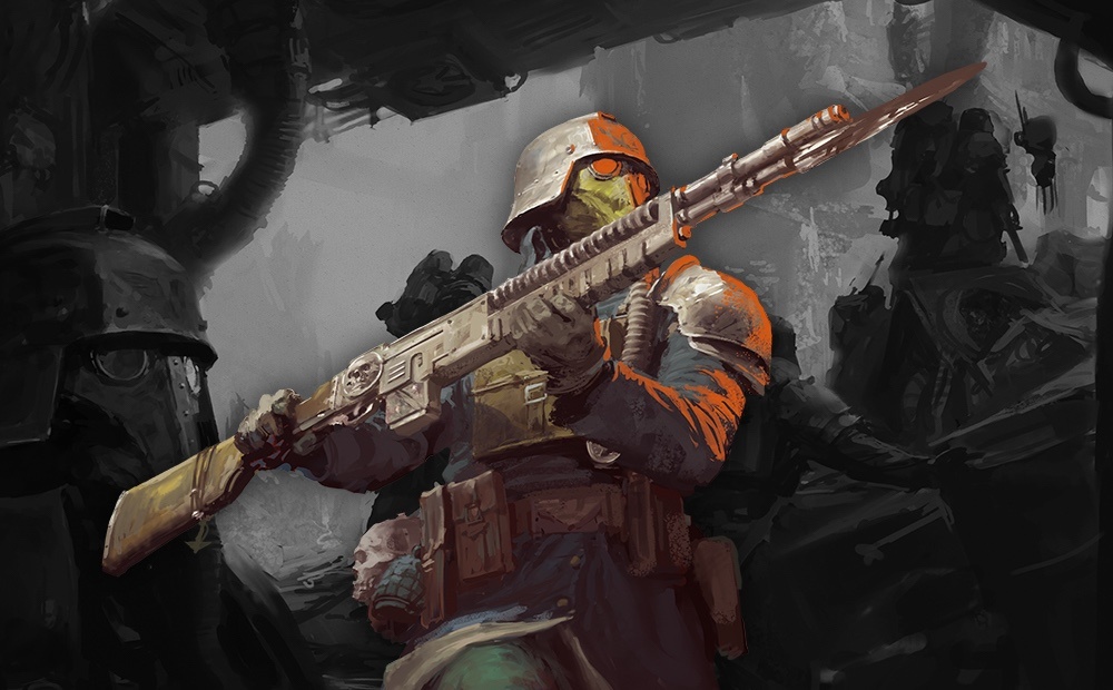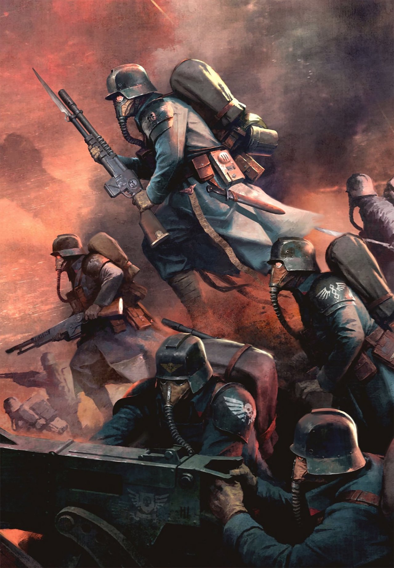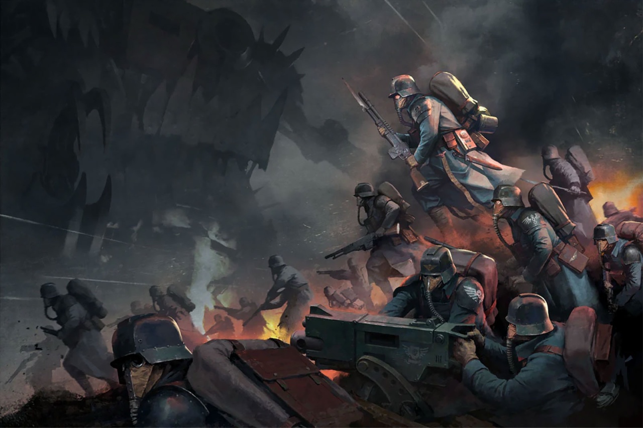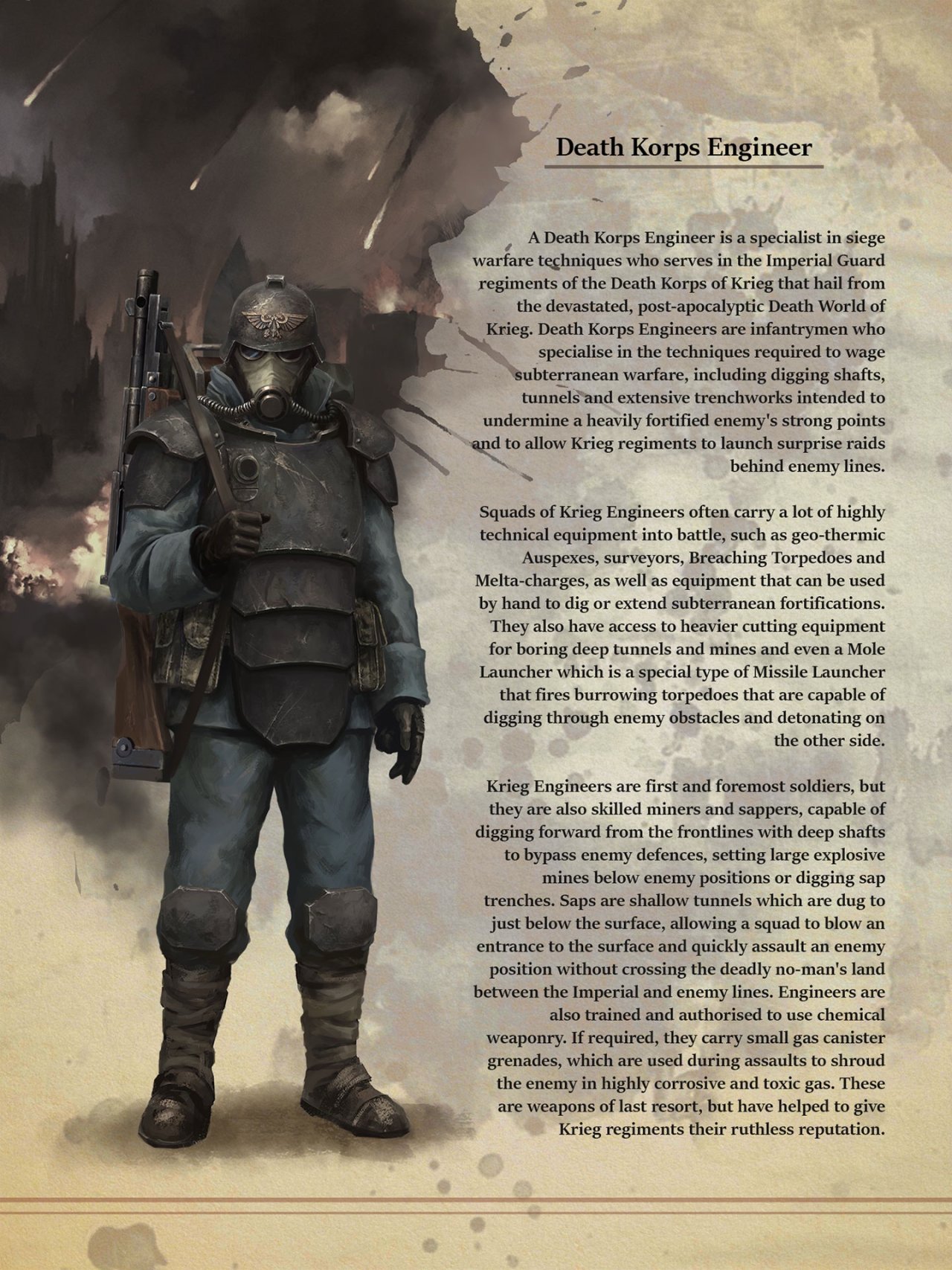 在官方設定裏,“克里格死亡軍團”(Death Korps of Krieg)是完全來自克里格行星的團級部隊統稱。它們是標準的攻城與塹壕戰專家:喜歡重炮、鐵絲網、地下工事和幾乎無窮無盡的步兵衝鋒,最擅長那種打到你精神麻木、地圖全是彈坑和屍體的消耗戰。