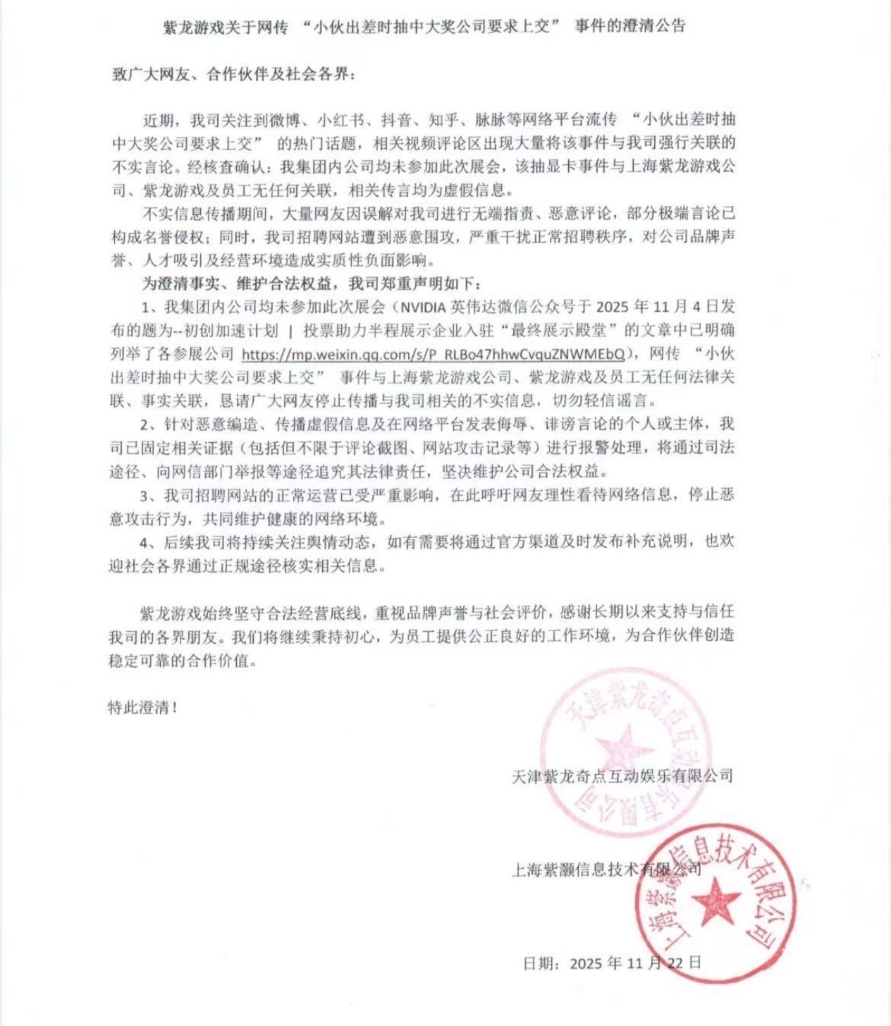 11月22日,紫龙游戏就近日网络热议的“实习生出差异常抽中显卡被要求上交”事件发布官方澄清公告。公告指出,该事件与紫龙游戏及其员工无任何关联,公司集团内所有企业均未参加相关展会活动。