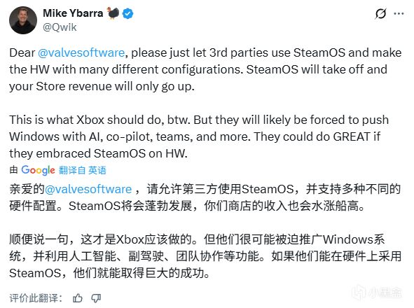 Ybarra还顺便“@”微软:Xbox其实最该拥抱SteamOS,可惜大概会被Windows AI、Copilot等绑架。