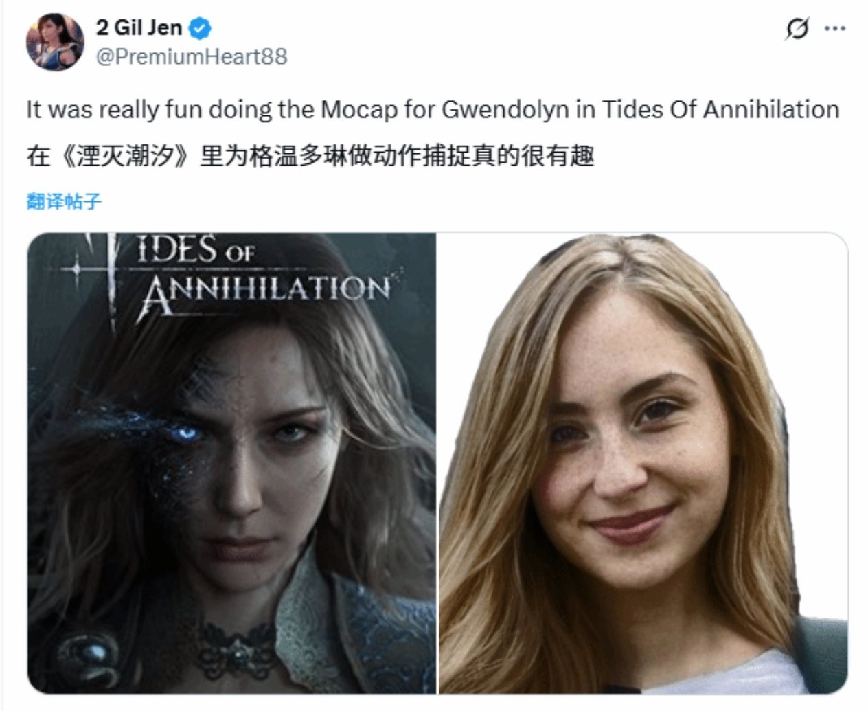 近日,一位名为X2 Gil Jen的用户在社交媒体上发文,声称自己是国产动作冒险游戏《湮灭之潮》女主角格雯德琳的动作捕捉演员。该推主同时透露自己是《最终幻想》系列的忠实粉丝,并晒出了多张个人生活照。
