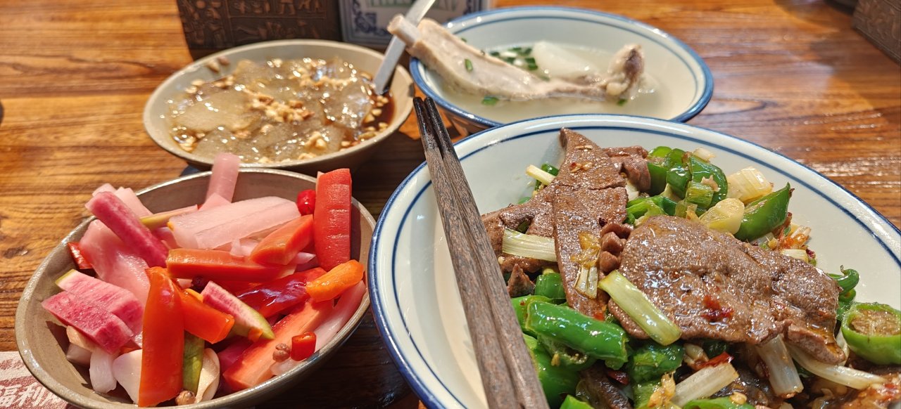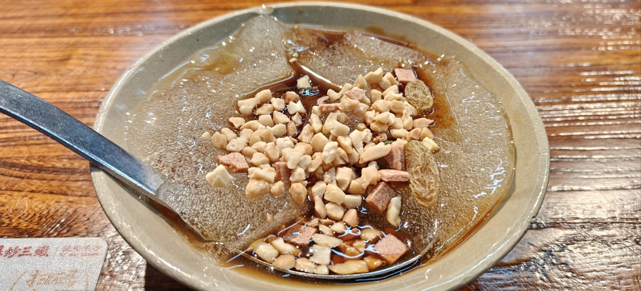 冰粉裏氣泡較多,不過是不是手搓的我也喫不出來,口感還不錯,也不太甜。泡菜量很大,鹹酸微甜,各種蘿蔔都清脆爽口。