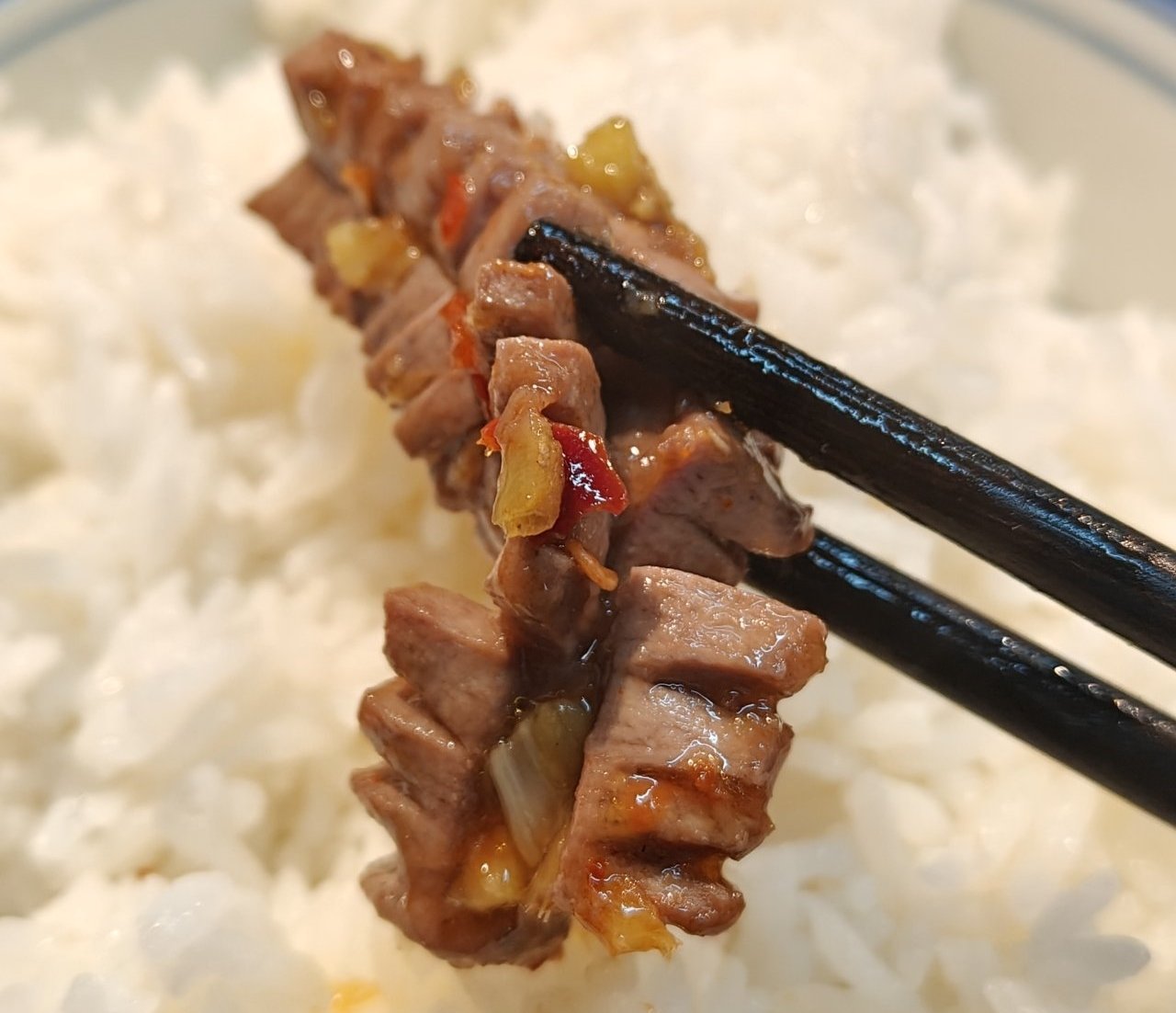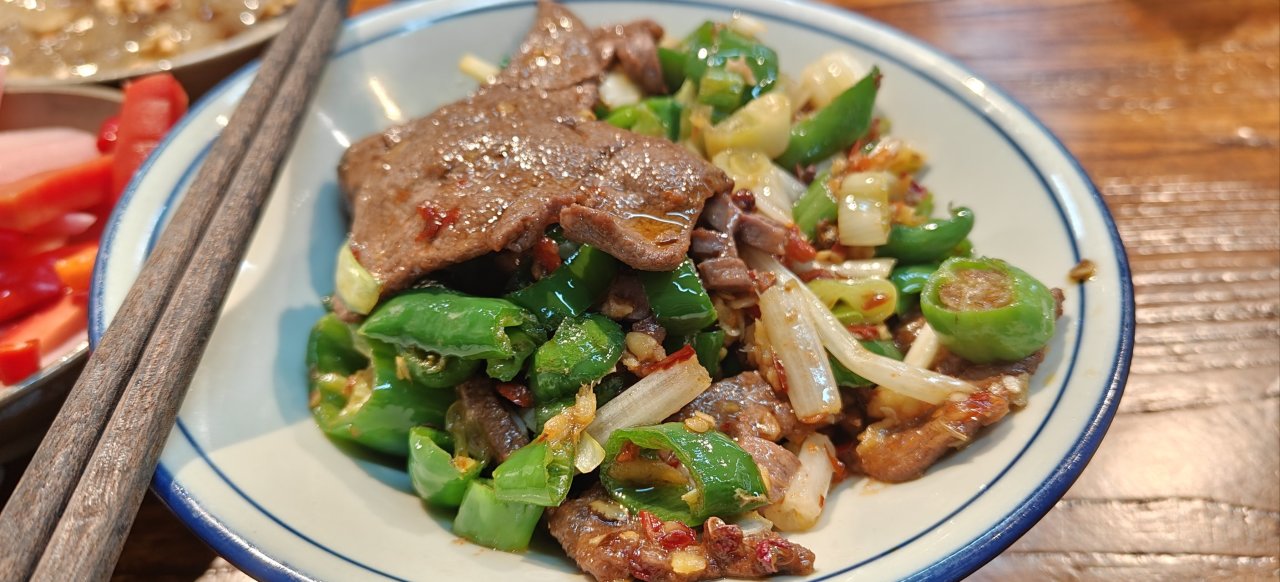 調味上偏川味家常炒法,但沒放泡姜泡椒,只放了豆瓣,青辣椒雖然有不少,但我覺得這款辣椒的香味和辣味都差一點,青椒的清香味菜裏基本嘗不出來,我單喫辣椒也覺得不辣(但隔壁桌的姑娘喫得斯哈斯哈的),另外我喫着覺得是用菜籽油炒的,這很川渝。
