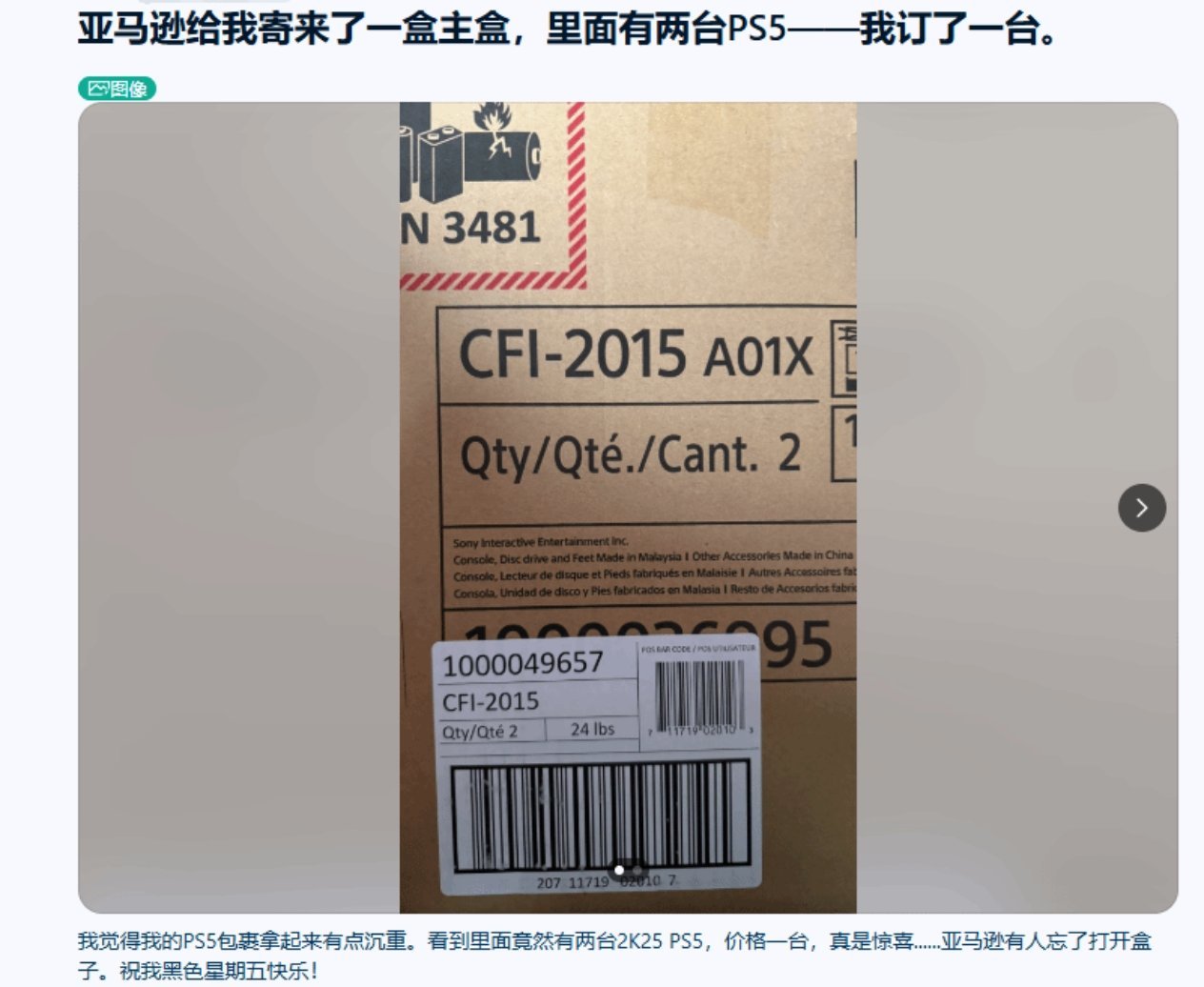 一位玩家在亞馬遜平臺購買了一臺PS5遊戲機,收貨時卻驚喜地發現箱子裏裝着兩臺主機。他在Reddit論壇上分享這一奇遇,喜悅之情溢於言表。