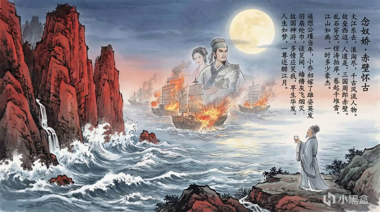 ▼下图是AI吃了苏轼 《念奴娇·赤壁怀古》之后,交出的答卷(4K分辨率)作者只用了一句提示词:根据以下古诗画一幅画,并附上原文 [ 即《念奴娇·赤壁怀古》原文 ]。
