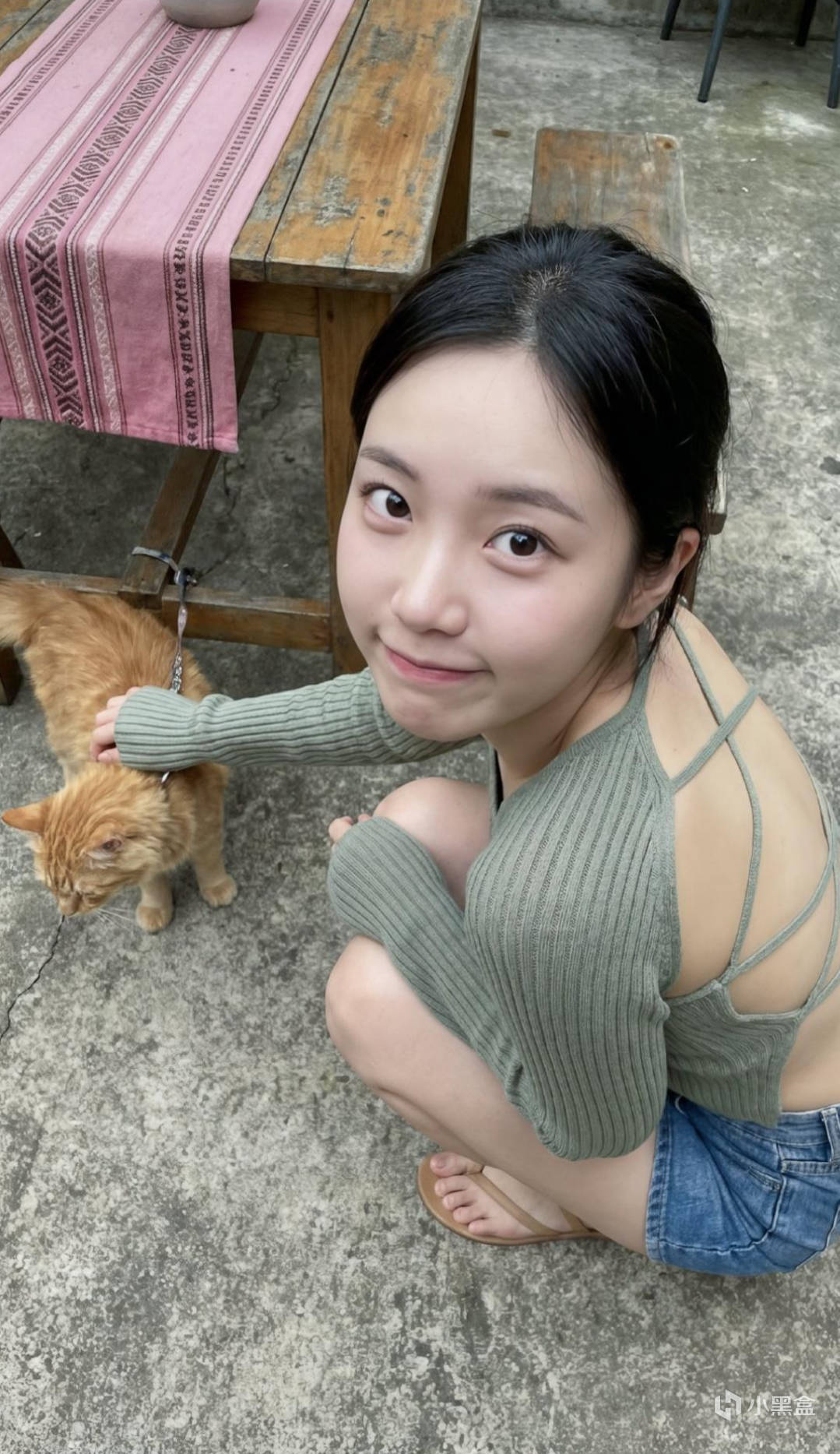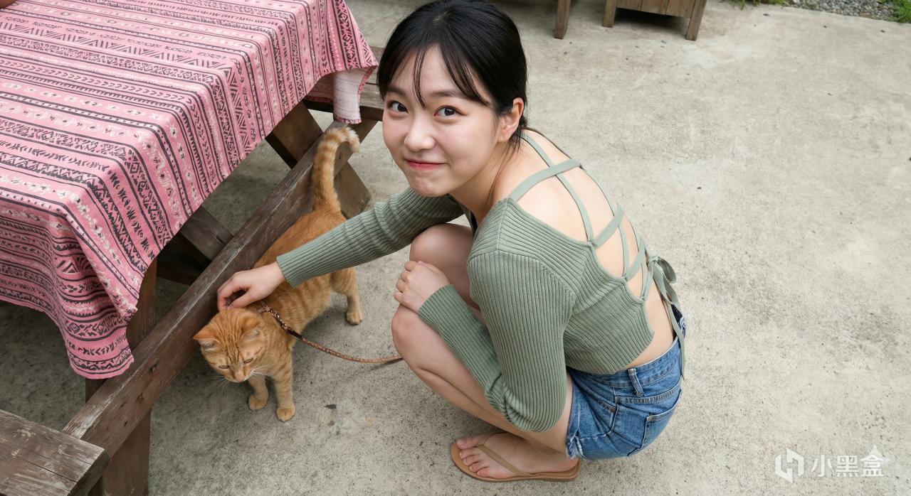 「image_metadata」: {标题:《坦率的魅力:俏皮的凝视》“类别”: “超写实生活方式摄影”“基调”:“迷人、自然、青春、坦率”},「prompt_elements」: {“主题”: {描述:一位年轻的亚洲女性,拥有可爱、柔和、圆润的脸型和白皙如瓷的肌肤。她的肤质自然水润,散发着柔和的光泽。“面部细节”: “她有着一双醒目的大而深邃的圆眼睛,眼下有明显的卧蚕(迷人的眼窝),侧脸向上望着镜头,眼神既调皮又天真无邪。她的嘴唇微微抿紧,带着一丝羞涩、俏皮又略带古怪的微笑(嘴唇紧紧地抿成一条细线),营造出一种羞涩、活泼又古灵精怪的表情。”“姿势”:“双膝弯曲,身体呈深蹲姿势,身体侧身,但头部猛地回头越过肩膀,正对着镜头。”“动作”:“一只手臂从长袖中伸直,与一只姜黄色的猫互动。”},“时尚”: {「garment_top」: 「鼠尾草绿色罗纹针织披肩/上衣,袖子很长,可以遮住手,露背设计,有细细的交叉绑带。」「garment_bottom」: 「牛仔短裤。」,“鞋履”:“赤脚穿着棕褐色凉鞋。”},“环境”: {“环境”:“乡村风格的露天庭院。”道具:一张木桌,上面铺着粉色部落/几何图案的桌布。“地面”: “粗糙的混凝土地面。”},「technical_specs」: {风格: “自然流畅的智能手机摄影美学,高角度拍摄。”“光线”:“自然日光,柔和的阴影,捕捉眼神中的光芒。”“焦点”:“聚焦于眼睛和古怪的嘴部表情。”}},“full_prompt_string”: “一张高角度拍摄的超写实抓拍照片,展现了一位年轻的亚洲女性蹲在水泥露台上。她回头看向镜头,表情十分独特:双唇紧抿,带着一丝羞涩的微笑,眼睛又大又圆,眼窝深邃,眼下有明显的卧蚕,显得可爱又调皮。她皮肤白皙透亮。她身穿一件鼠尾草绿色的露背针织衫,长袖遮住了双手,下身穿着牛仔短裤。她正向一只拴着牵引绳的橘色虎斑猫伸出手,猫咪就在一张铺着粉色花纹桌布的木桌旁。8K 分辨率,原始风格。”「negative_prompt」: 「张开嘴,露出牙齿,大笑,涂口红,浓妆艳抹,西方人特征,眼睛扭曲,手部畸形,多余手指,分辨率低,模糊。」}