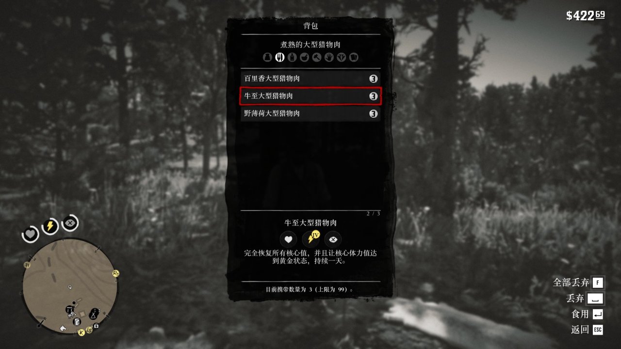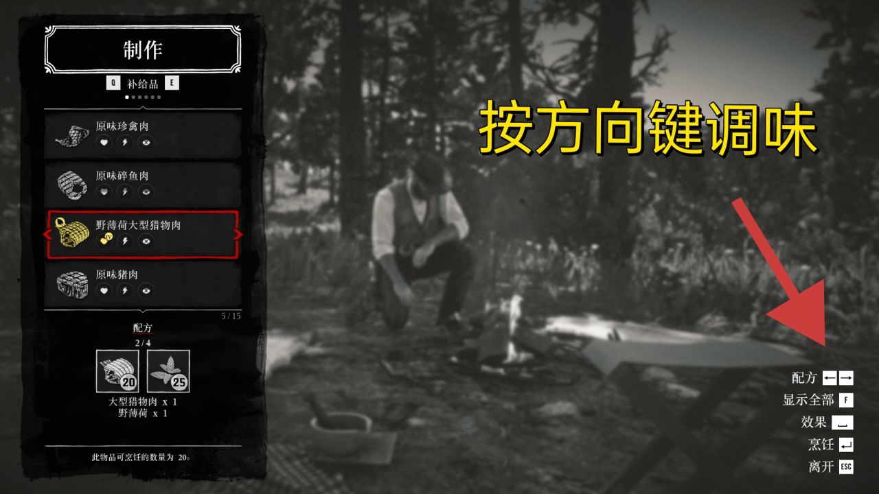 然后扎营制作,选择大型猎物肉,按方向键←→分别把3种调味品加进去,做出来3种大型肉,分别吃一个就可以把3核心都变黄