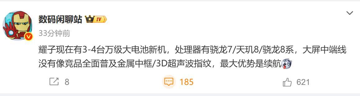 續航一直是智能手機的一大痛點,隨着硅碳負極電池技術開始大規模商用,電池的能量密度大幅提升,在相同的體積下可以裝下更大容量的電池,於是各大手機廠商開始卷電池容量,而卷的最兇的當數榮耀。目前榮耀已推出多款電池容量8000mAh以上的手機,近期榮耀萬級大電池新機曝光,電池容量再次大漲,有望突破10000mAh。