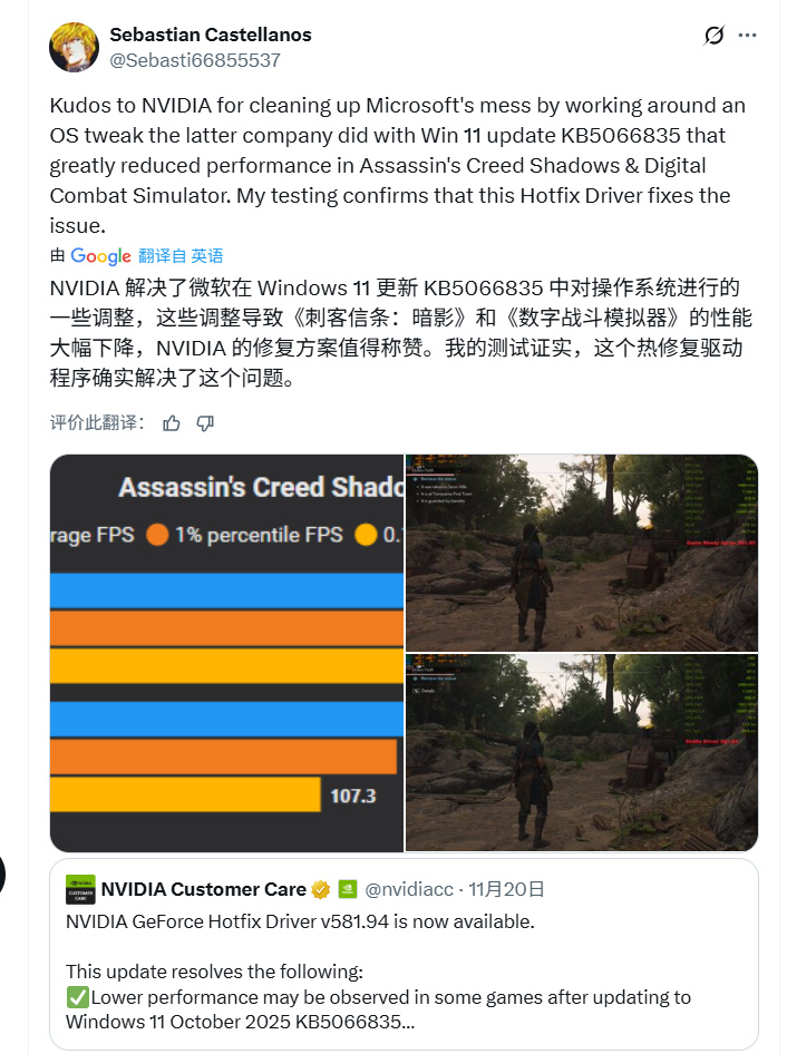 部分用户在社交平台上分享的测试结果显示,在安装英伟达最新的 581.94 热修复驱动后,游戏性能获得了显著“恢复”。有用户报告称,在《刺客信条:影》(Assassin's Creed Shadows)等游戏中,平均帧率相比之前安装受影响的驱动版本时,提升幅度高达 47%;1% 低帧率也获得了约 46% 的改善。另一位用户甚至报告了从旧驱动版本升级到热修复驱动后,性能提升达到 65%。