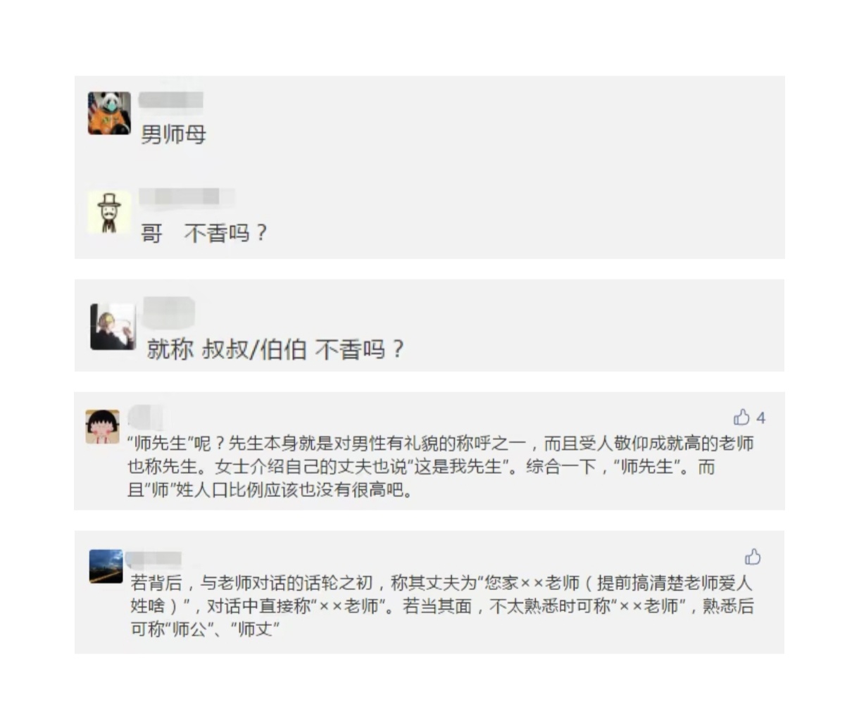 多才多艺的网友们也没闲着,有网友表示,可以称呼为“男师母”“师先生”,甚至更亲近、随意一点。