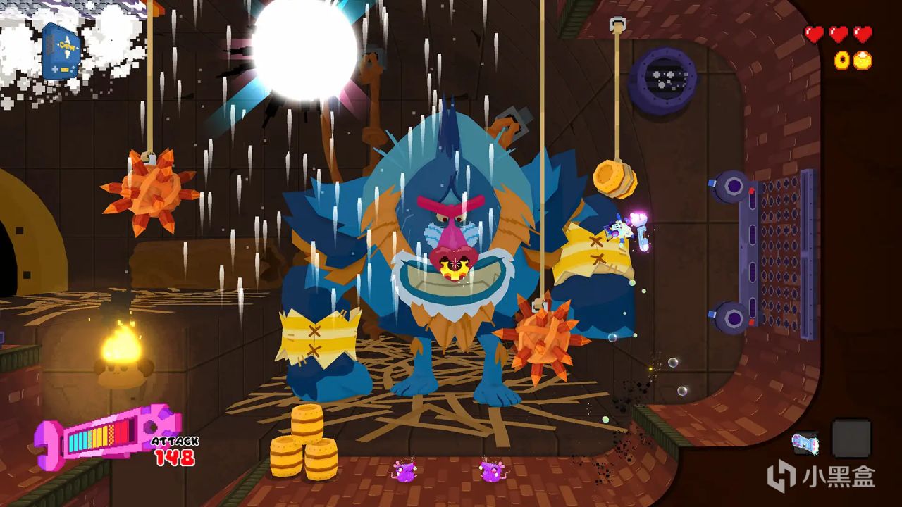 还有我最喜欢的最惊喜的一部分是它的boss战,因为它是在一个充满着各种设施机关的超大平台跳跃关卡发生的boss战,你需要通过躲避陷阱并借助各种机关到boss的位置攻击boss,且在有些boss血量降低的时候还会出现机关变化,就是规划好各种路线一路爽冲拿下boss的感觉真滴棒。而且最后一关的限时逃亡搭配着前面的所有机关的收尾无论是跑酷的刺激性还是各种机关的配合演出效果真滴拉满。